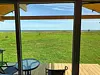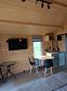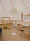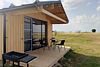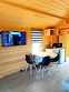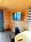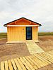Однокомнатный дом с прихожей, санузлом и пристройкой в виде террасы с летней мебелью и переносным мангалом.