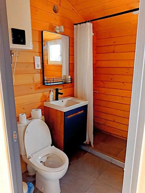Санузел с душем, шкаф, холодильник, микроволновка, электрическая плитка, чайник.