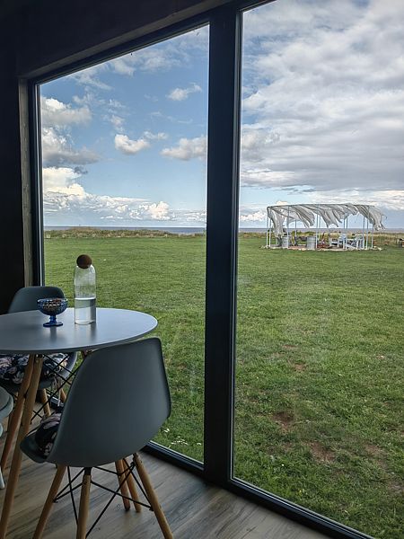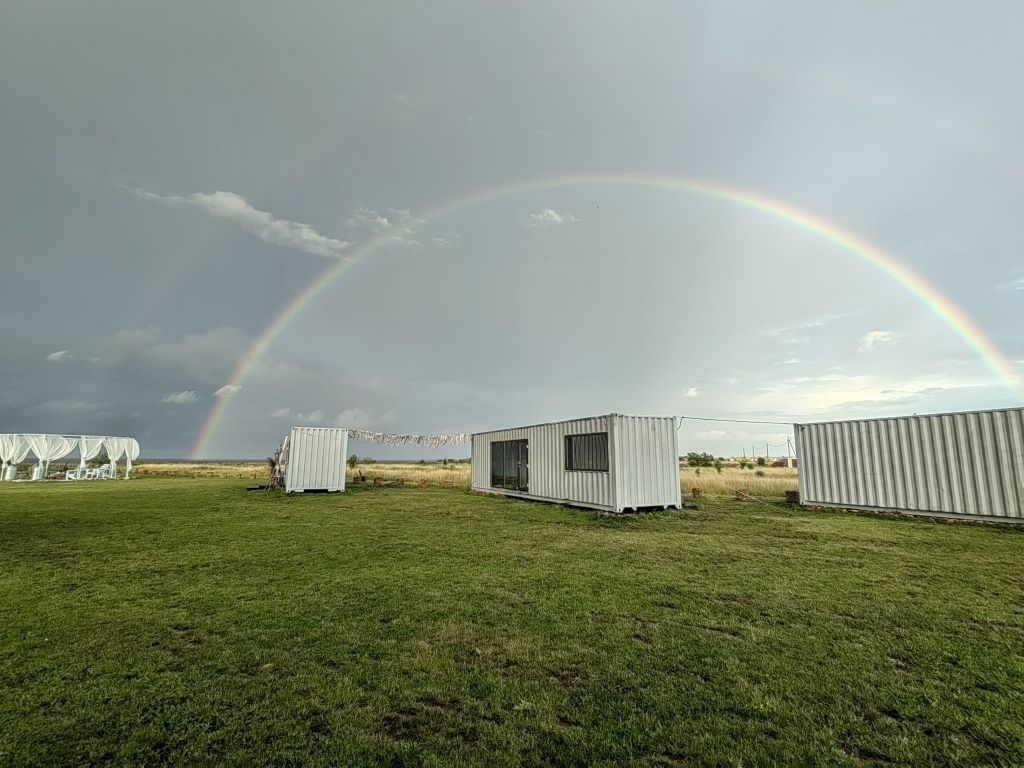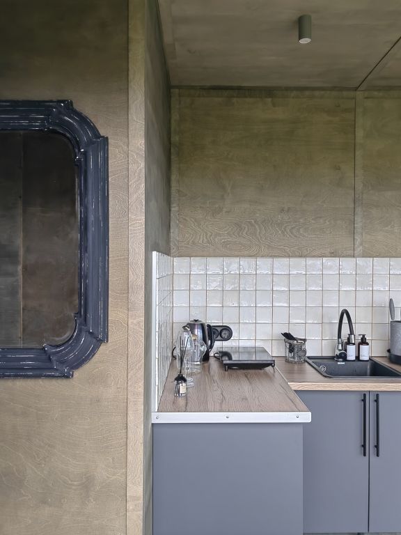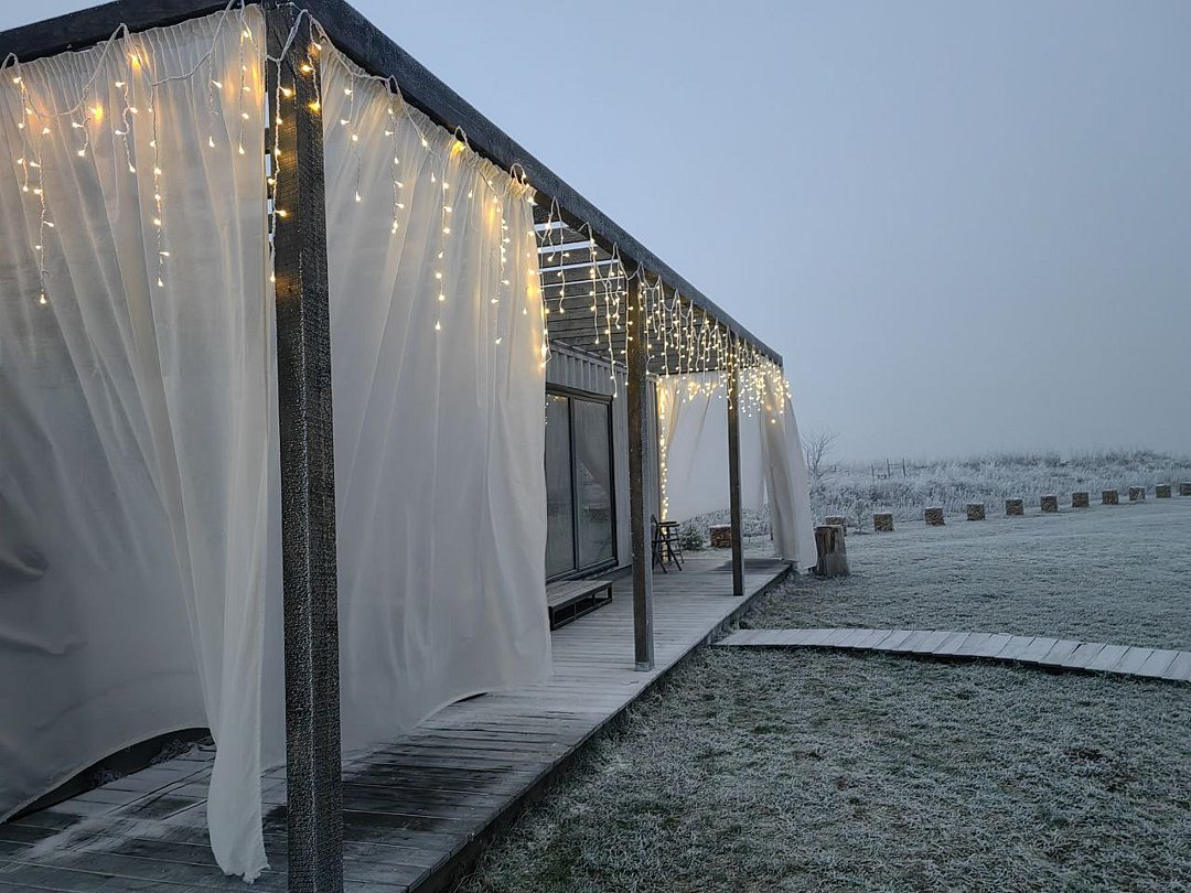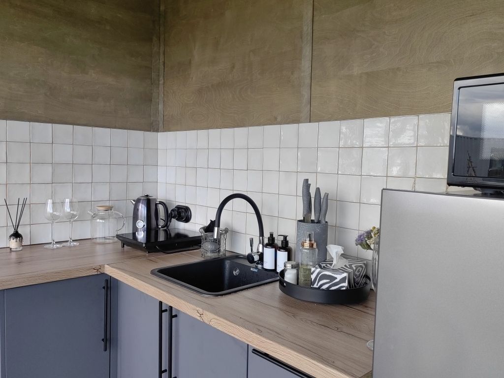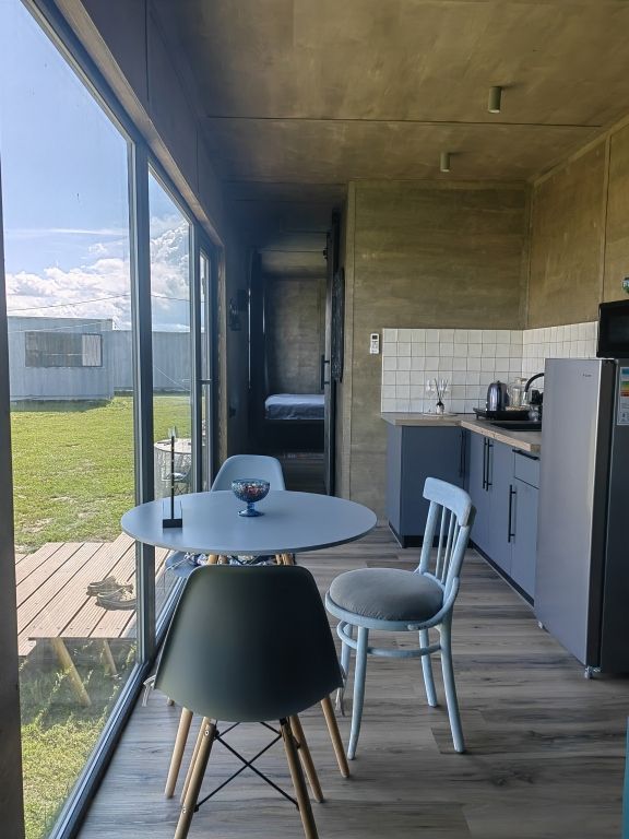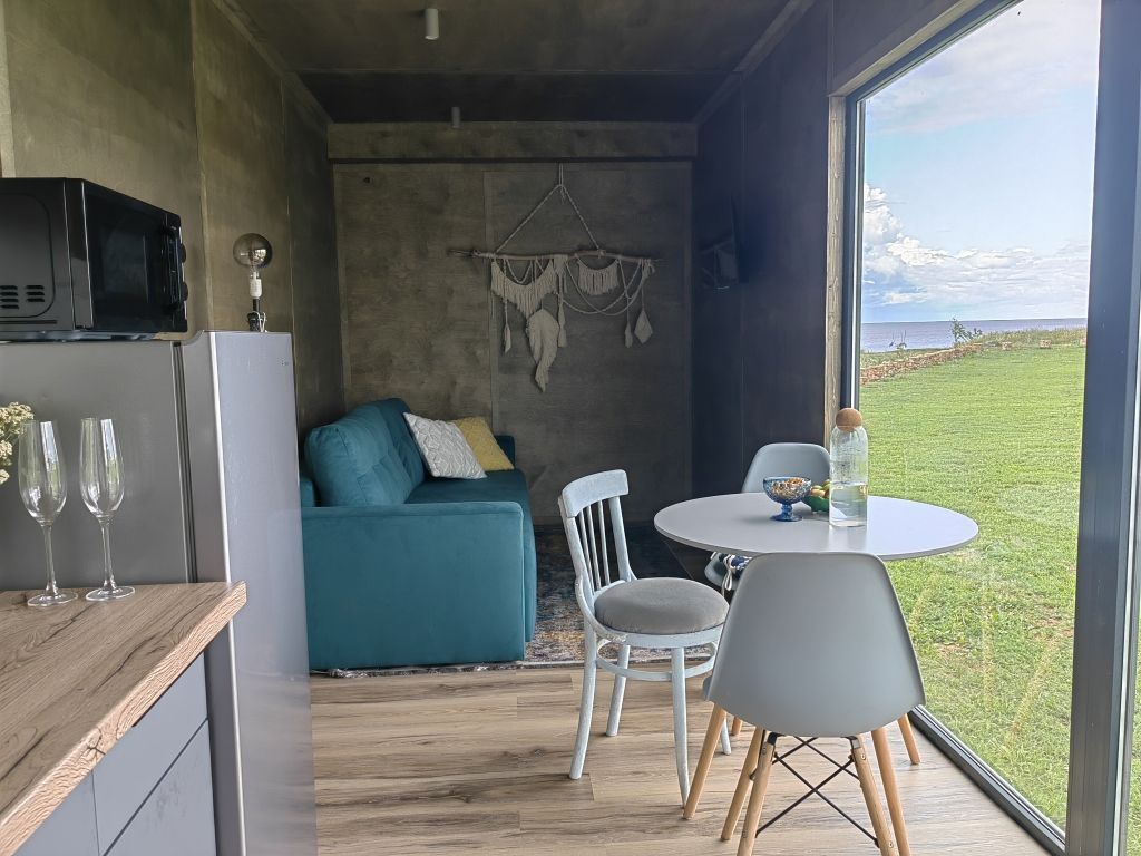 Для проживания гостей подготовлены панорамные дома-контейнеры с захватывающим видом на озеро, оборудованы всем необходимым. В вашем распоряжении кухня, оснащенная плитой, холодильником и набором посуды. Спальня с панорамным окном, ванная комната с гигиеническими принадлежностями, а также гостиная и обеденная зона.