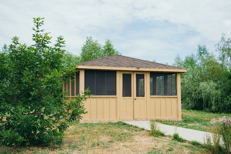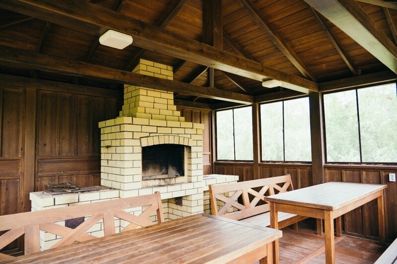 Для комфортного отдыха большой компании может быть предложена беседка, оснащённая москитными сетками, которая находится на острове. Беседка оборудована деревянной мебелью, печью на дровах и мангалом; также подведена вода.