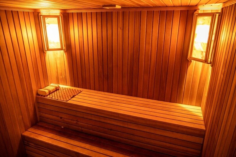 Русская баня с просторной парилкой из канадского клёна и солевыми лампами; с комнатой отдыха и выходом на воду.