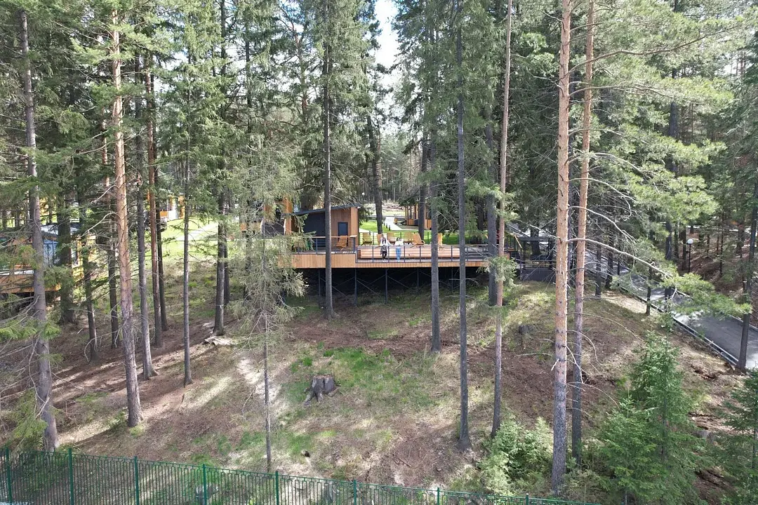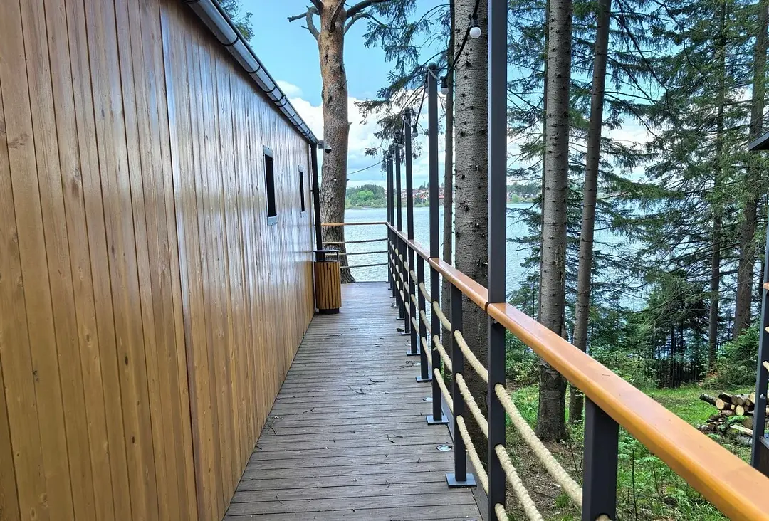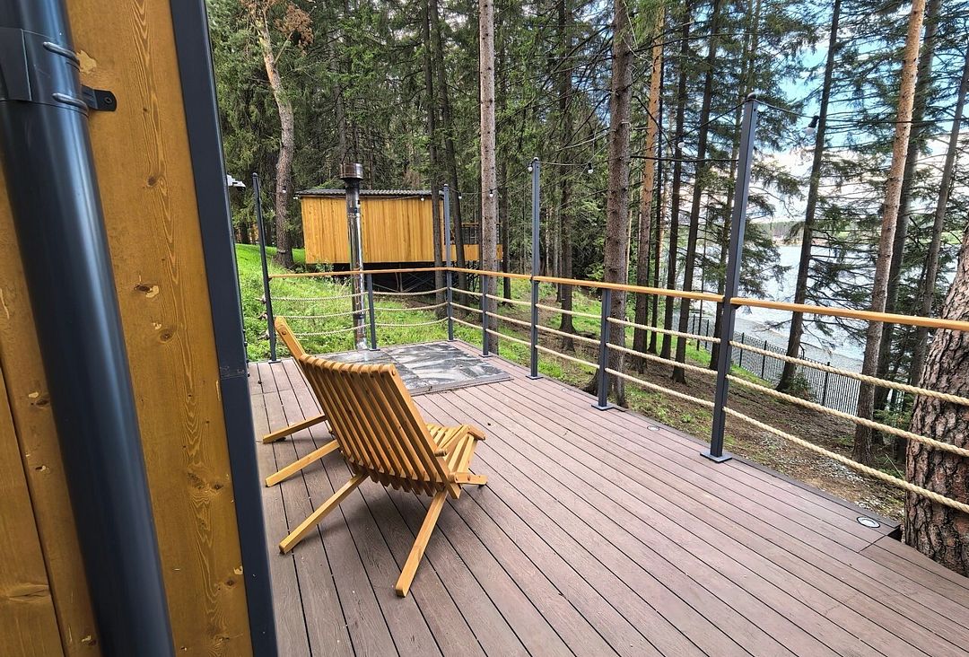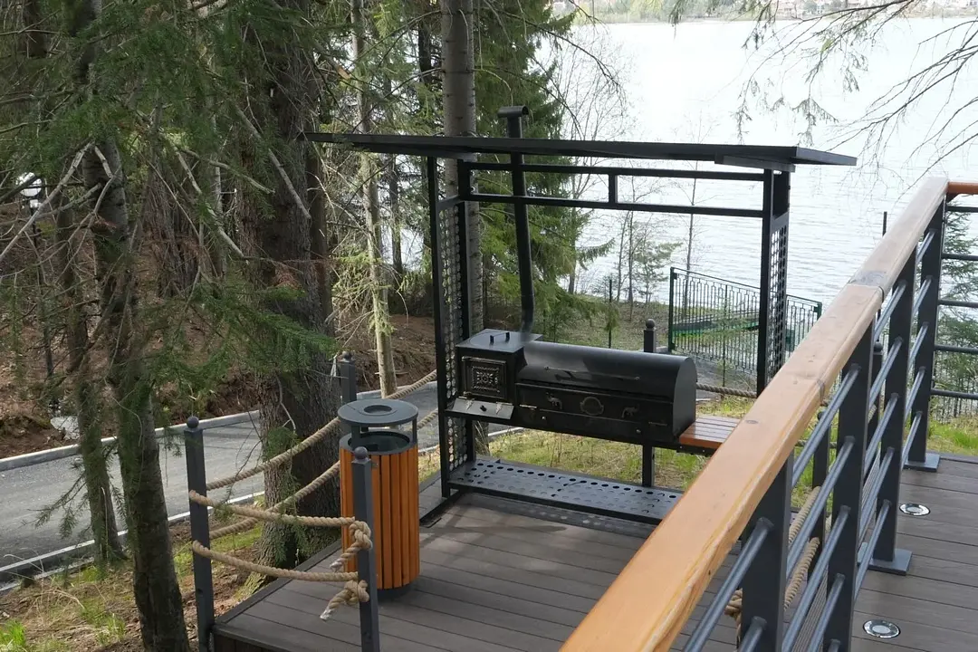 Возле каждого домика оборудована удобная мангальная зона с мангалом, барбекю-принадлежностями и печью для казана. Для вашего расслабленного отдыха подготовлена удобная площадка с комфортными качелями, шезлонгами и уютными гамаками под открытым небом. Для всех семей с детьми в комплексе организована просторная и безопасная игровая зона. Также в распоряжении гостей настоящая русская баня с горячей купелью на дровах и видом на водохранилище.