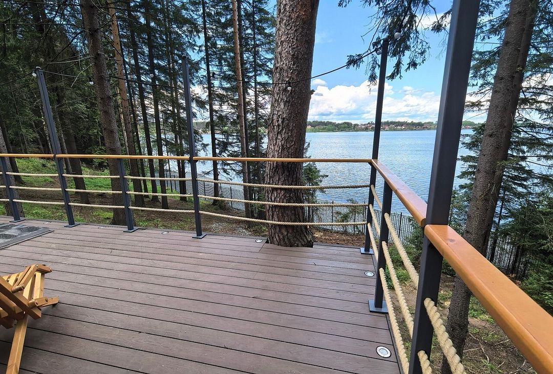 На территории есть отдельная мангальная зона. С террасы открывается живописный вид на лес и водохранилище. Идеальное место для вашего события на природе.