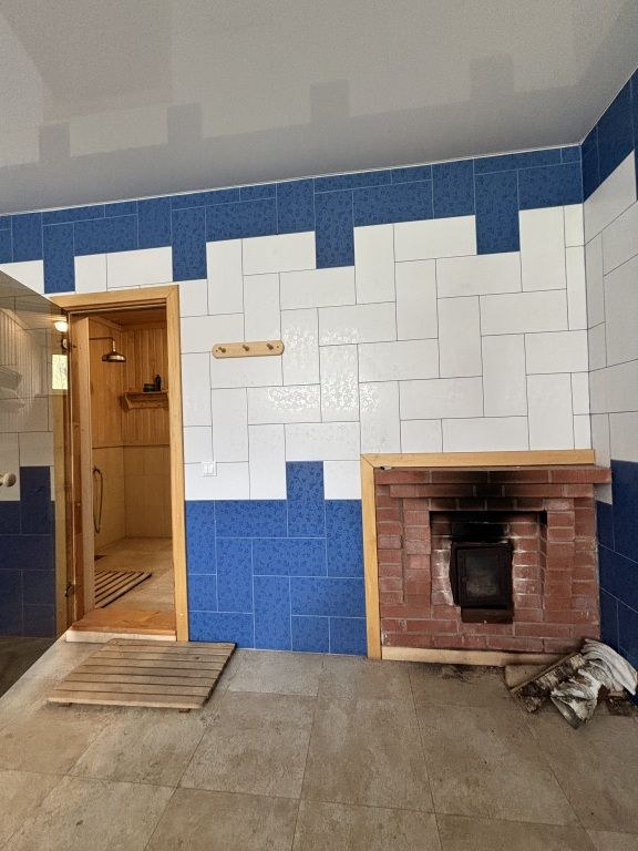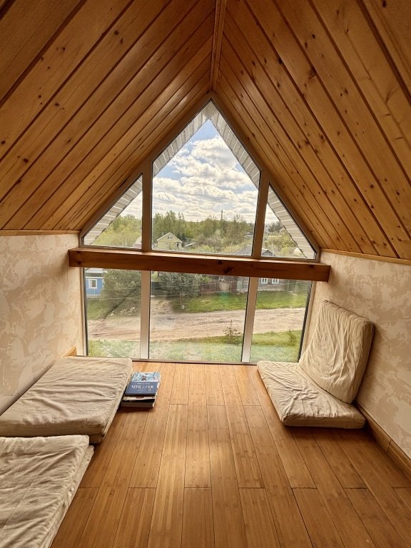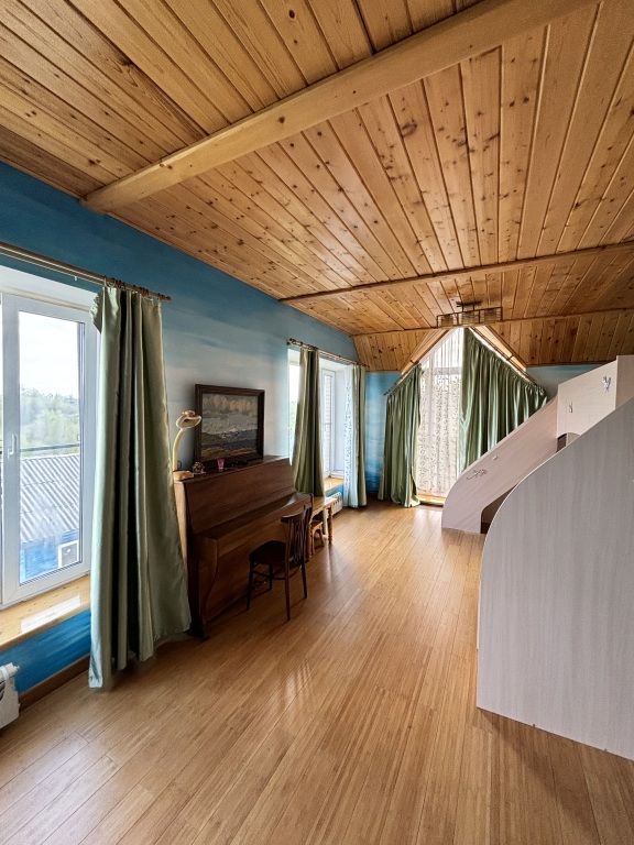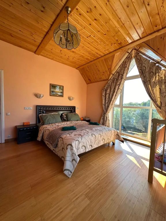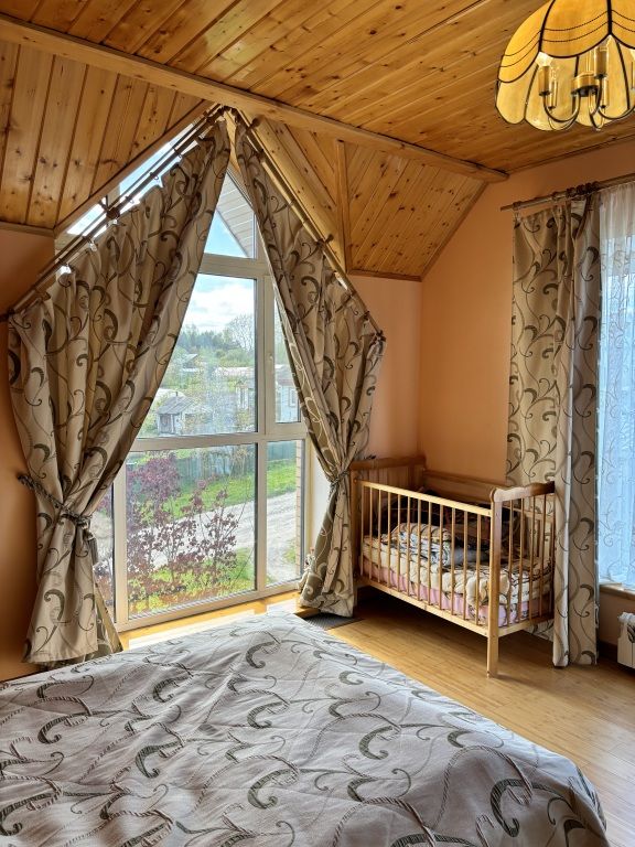 В коттедже могут разместиться до 12 гостей. К услугам гостей постельное бельё и полотенца, а также камин, мангал, дрова, двор с качелями, парковка, гараж, купель, баня на дровах. На первом этаже расположена кухня-гостиная, две спальни, санузел. На втором этаже — две спальни, детская, санузел. На цокольном этаже — баня, хозяйственный блок, гараж.