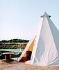 Рядом с палаткой — гриль и столик с парой кресел.