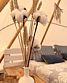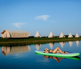 На острове, в центре лазурного озера, для проживания расположены несколько уютных палаток-типи, в каждой из которых есть двуспальная кровать с прикроватными полками, розетками, мягким подогреваемым матрасом, мини-шкаф, пуфики, гигиенический набор и уютное освещение.