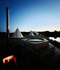 На территории глэмпинга оборудован крытый пати-тент с кухней, настольными играми, чаем, кофе и печеньками. Костровая и фотозоны, горячая купель на дровах, частный пляж, лежаки, 3 душа и 2 туалета.