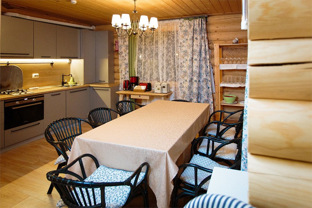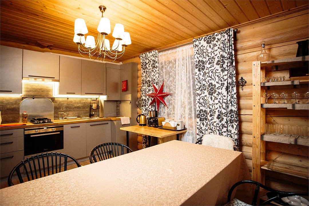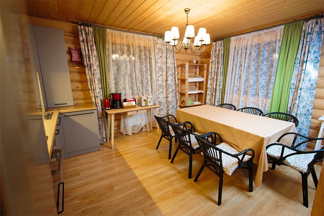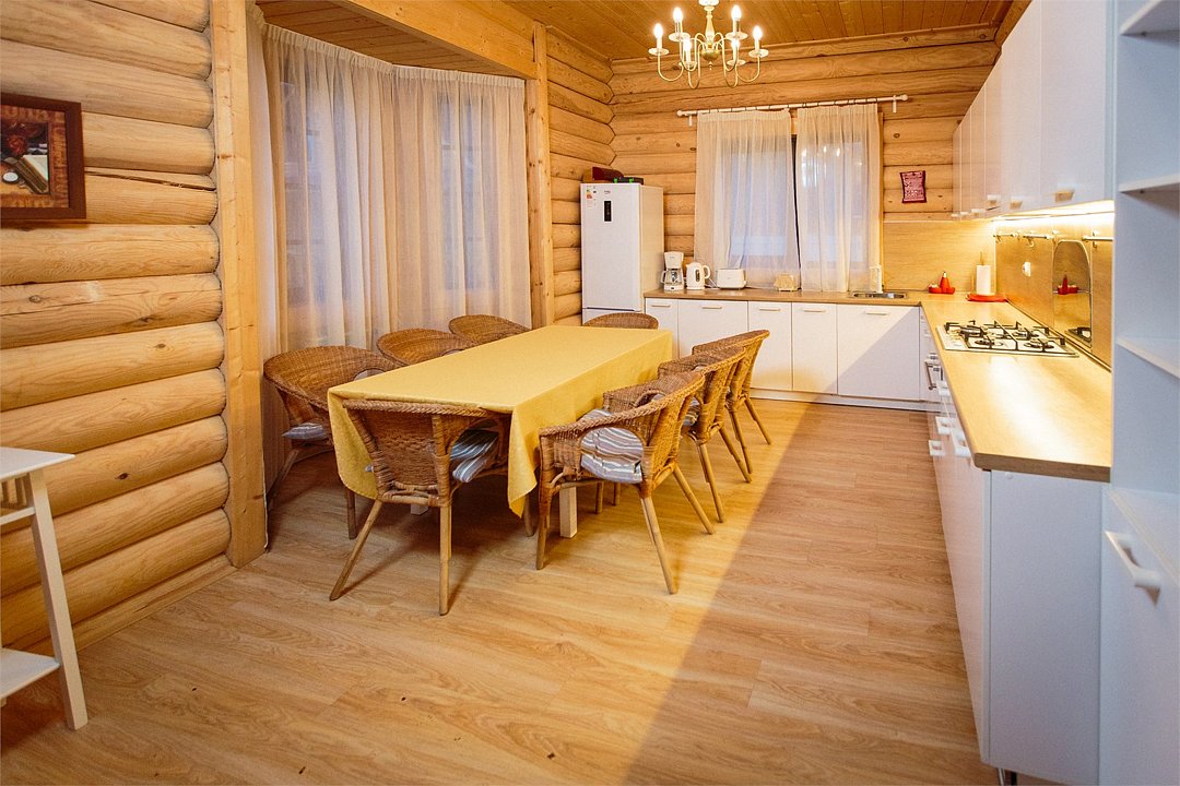 Наша гордость—просторный дом с двумя террасами и современной кухней-гостиной, где есть все необходимое. Но главное, почему гости любят именно этот коттедж — наличие сауны прямо на 1 этаже дома. Первый этаж распределен следующим образом: Кухня-гостиная; 1 спальня; Санузел; Сауна; 2 террасы; На втором этаже размещаются еще 3 спальни и санузел. Также на территории коттеджа обустроена бесплатная парковка на 4 автомобиля. Наши коттеджи прекрасно подойдут как для отдыха компанией с детьми, так и для праздника. Коттедж имеет все привычные современному человеку оснащение и, вместе с этим, находится в дикой природе. Так что вы сможет прекрасно отдохнуть и выспаться. Снять дом на 12 человек можно посуточно, на выходные или на целый месяц.Услуги и удобства