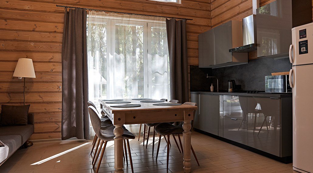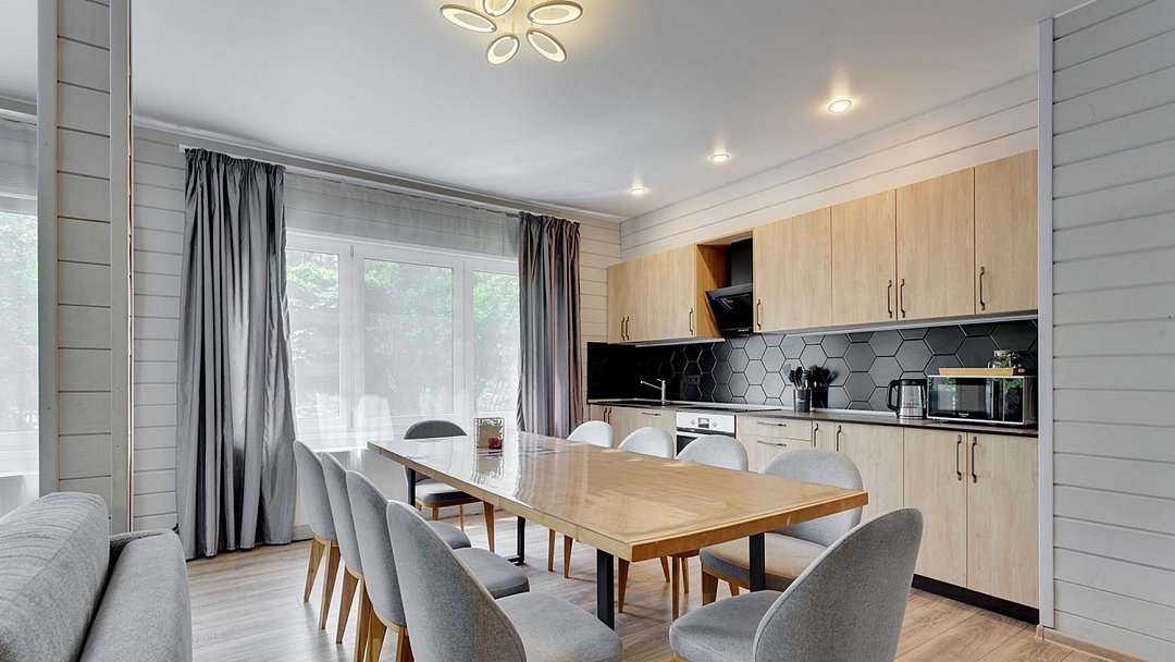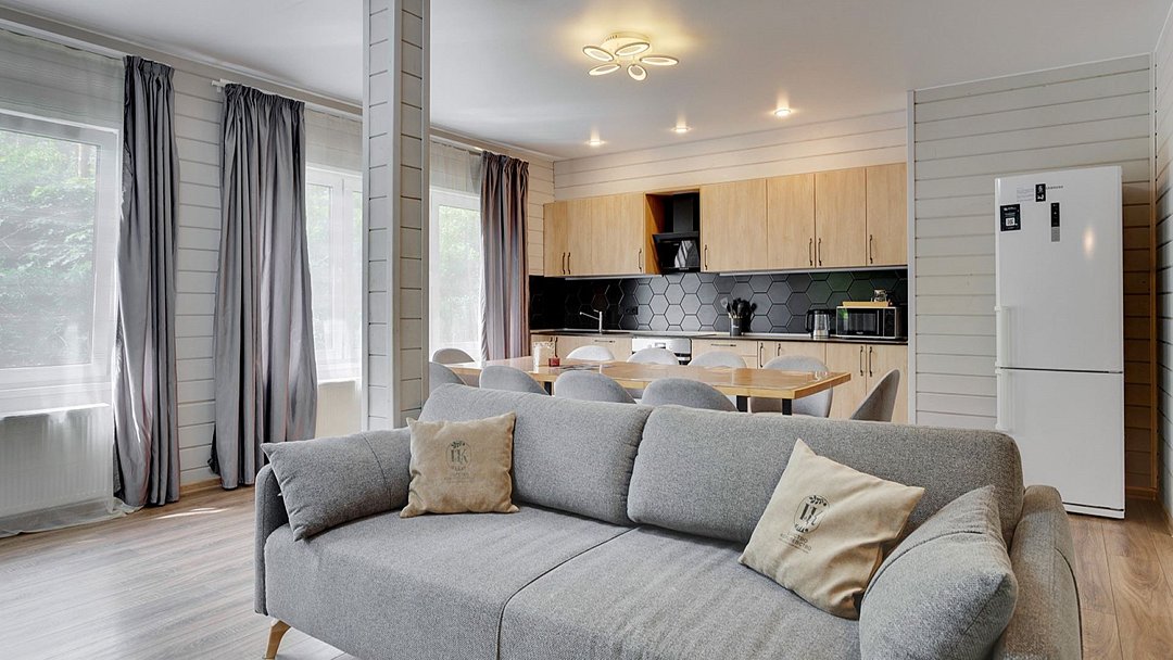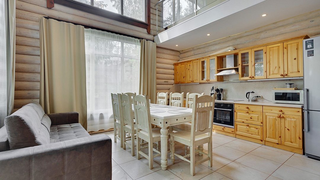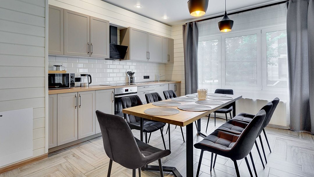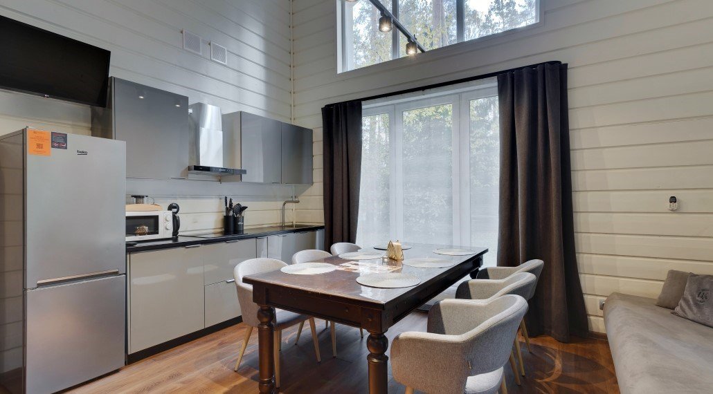 Премиальный коттедж, выполненный из сухостойной сосны Кело. В доме вы найдете две спальни с большими двуспальными кроватями, одну детскую спальню с комфортной двухъярусной кроватью и письменным столом. В вашем распоряжении два санузла с ванной и душем, стильная финская сауна. Кухня-гостиная с большим диваном, телевизором, обеденным столом на 6 персон и полностью оборудованной кухонной зоной, включающей духовой шкаф, варочную панель, микроволновую печь и посудомоечную машину. У дома есть 2 просторные террасы и персональная мангальная зонаУслуги и удобства