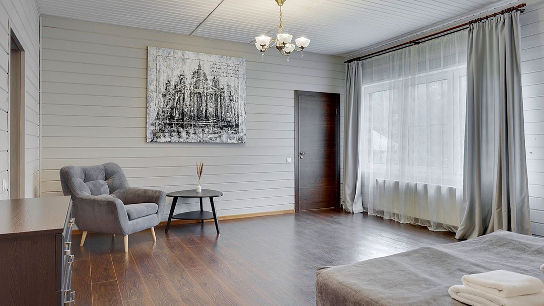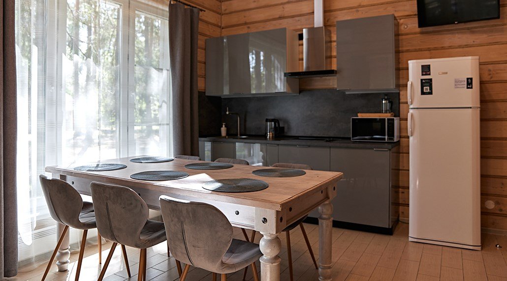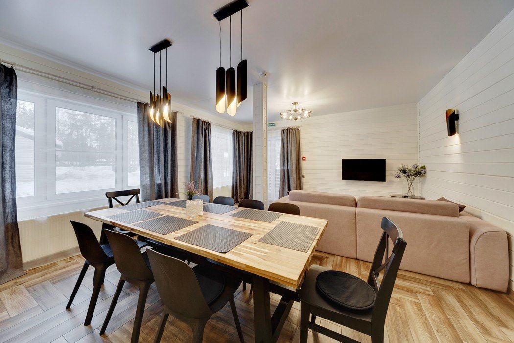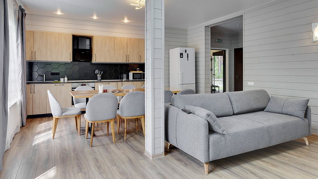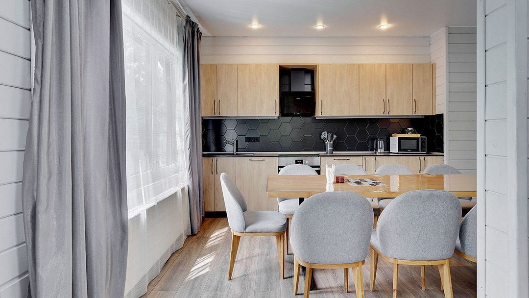 Премиальный коттедж, выполненный из сухостойной сосны Кело. В доме вы найдете две спальни с большими двуспальными кроватями, одну детскую спальню с комфортной двухъярусной кроватью и письменным столом. В вашем распоряжении два санузла с ванной и душем, стильная финская сауна. Кухня-гостиная с большим диваном, телевизором, обеденным столом на 6 персон и полностью оборудованной кухонной зоной, включающей духовой шкаф, варочную панель, микроволновую печь и посудомоечную машину. У дома есть 2 просторные террасы и персональная мангальная зонаУслуги и удобства