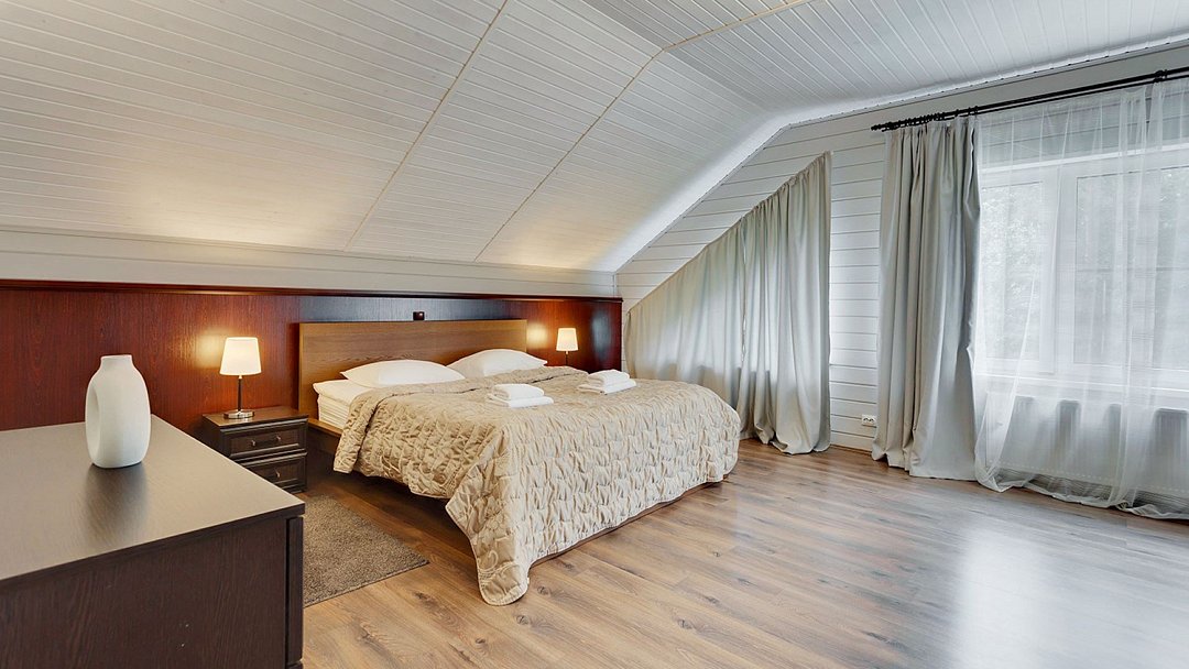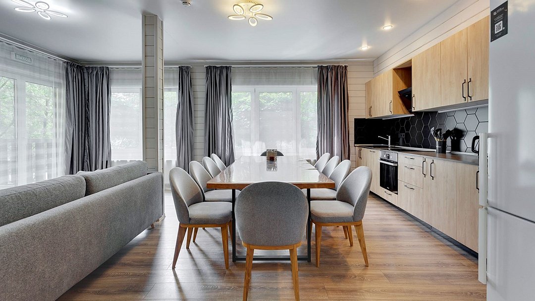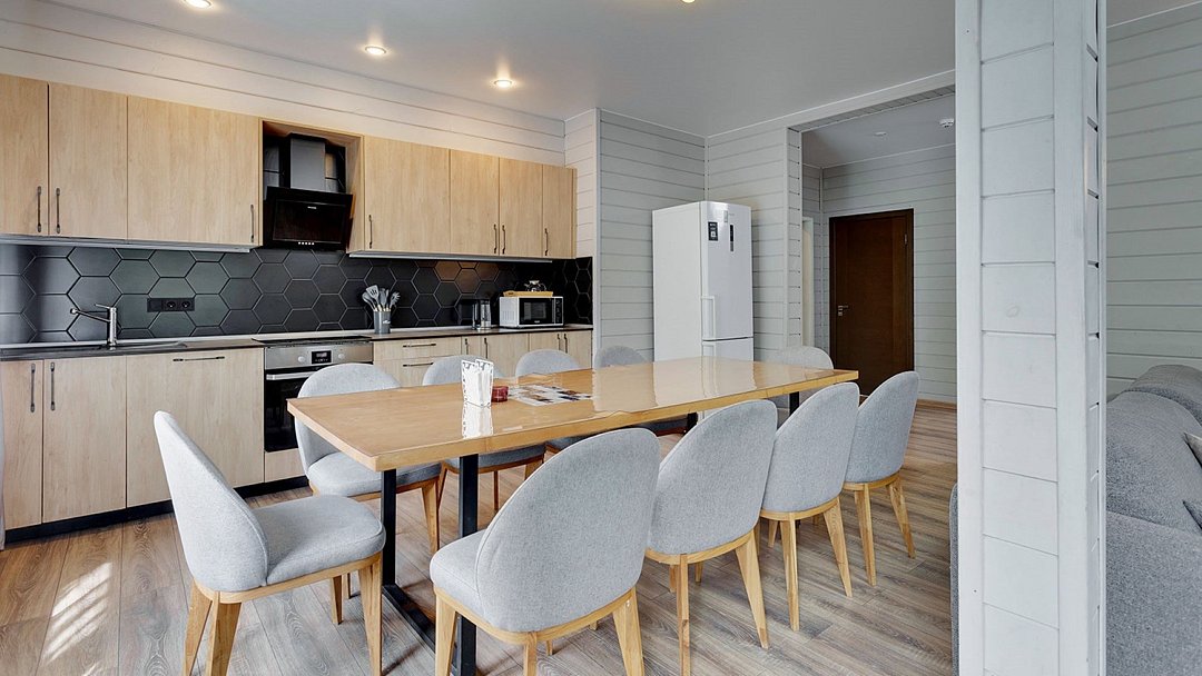Идеальный выбор для большой компании друзей или группы коллег. В одном доме может комфортно расположиться 10 взрослых гостей. Просторная кухня-гостиная, оборудованная всем необходимым, 5 спален, 2 санузла, гардеробная, терраса с мангаломУслуги и удобства