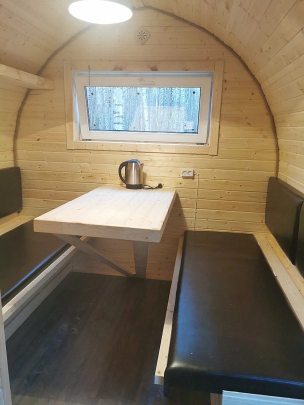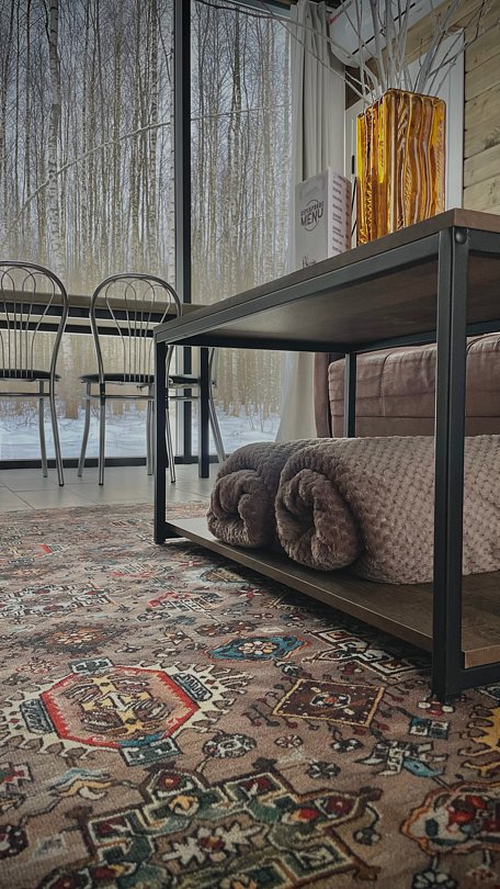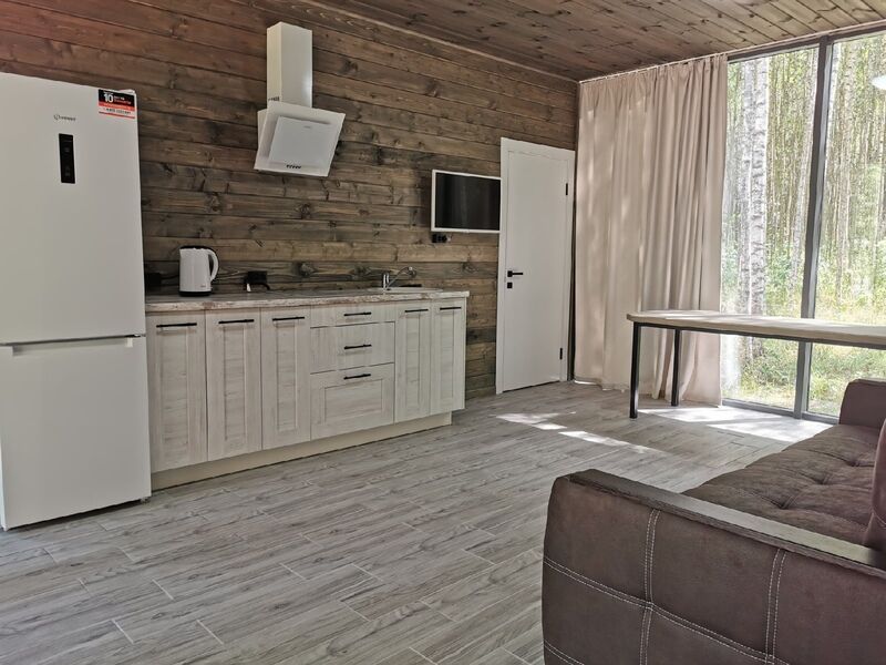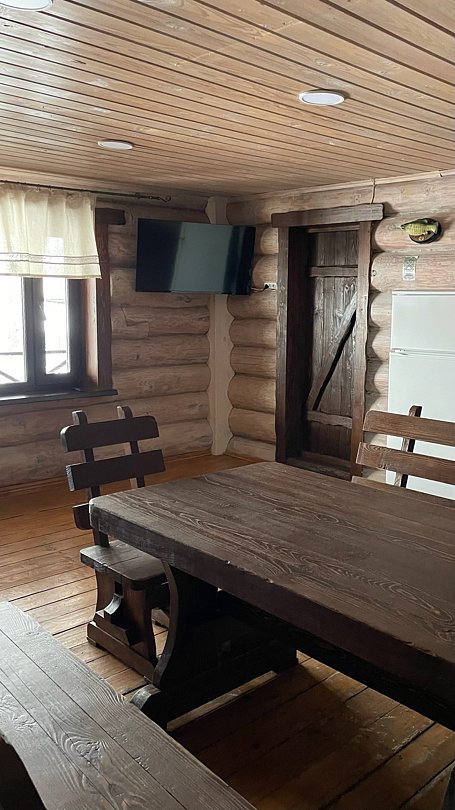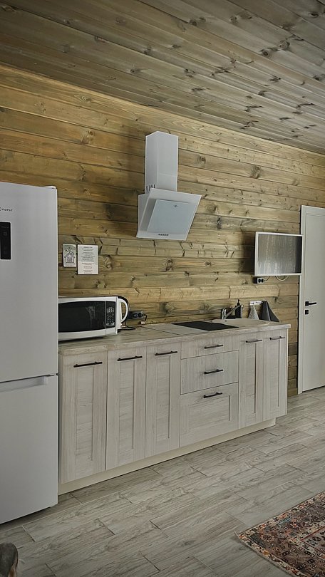 Дом прошел реновацию весной 2025 года. Первый этаж: гостиная с большим столом, телевизором и мини кухней - электроплита, микроволновая печь, большой холодильник, чайник, горячая вода, посуда для приготовления и сервировки. Баня в диком стиле из лиственницы и ольхи, с парилкой и помывочной.