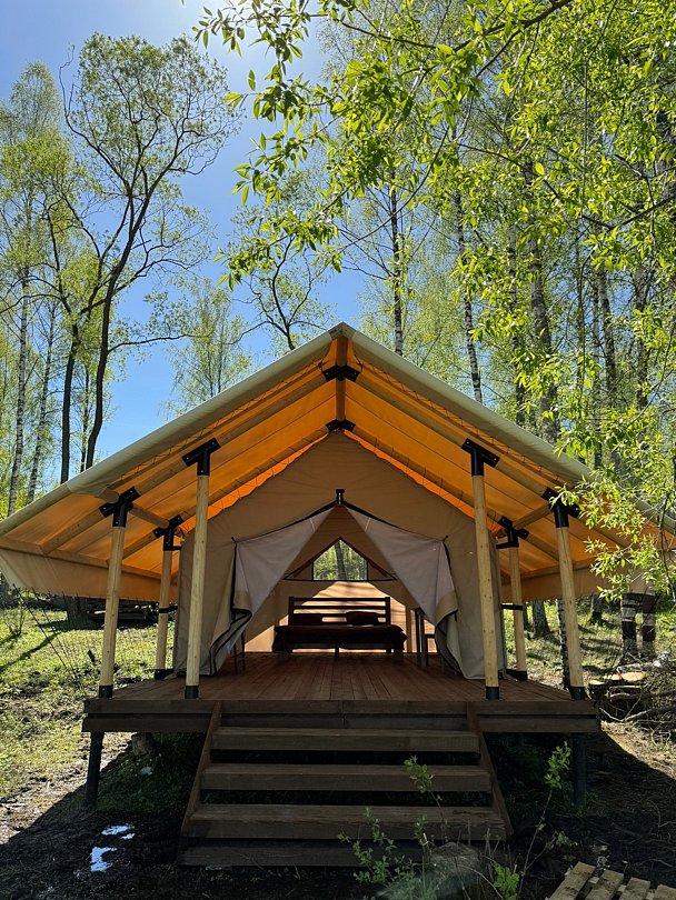 Семейный отдыхДостоинстваОтличная территория и выбор время препровождения. Отдыхали в Глемпинге, очень понравилось. В палатках есть свет, стол, «шкаф» мангал. Рядом река. Много мест для досуга. Хочешь палатку - пожалуйста, хочешь в люкс - подалуйста. На любой вкус домики. Удобный выход к реке, есть сапы, катамараны. Есть кафе. И очень хороший туалет, если вы приезжаете в Глемпинг или с палаткой. Отдыхом очень довольны.