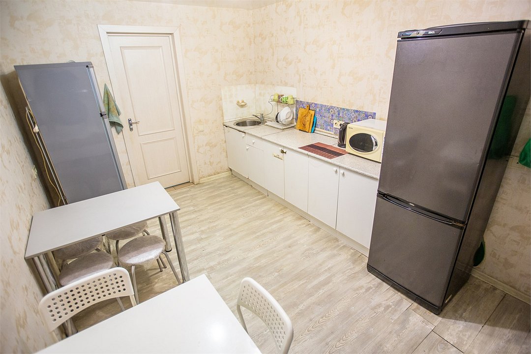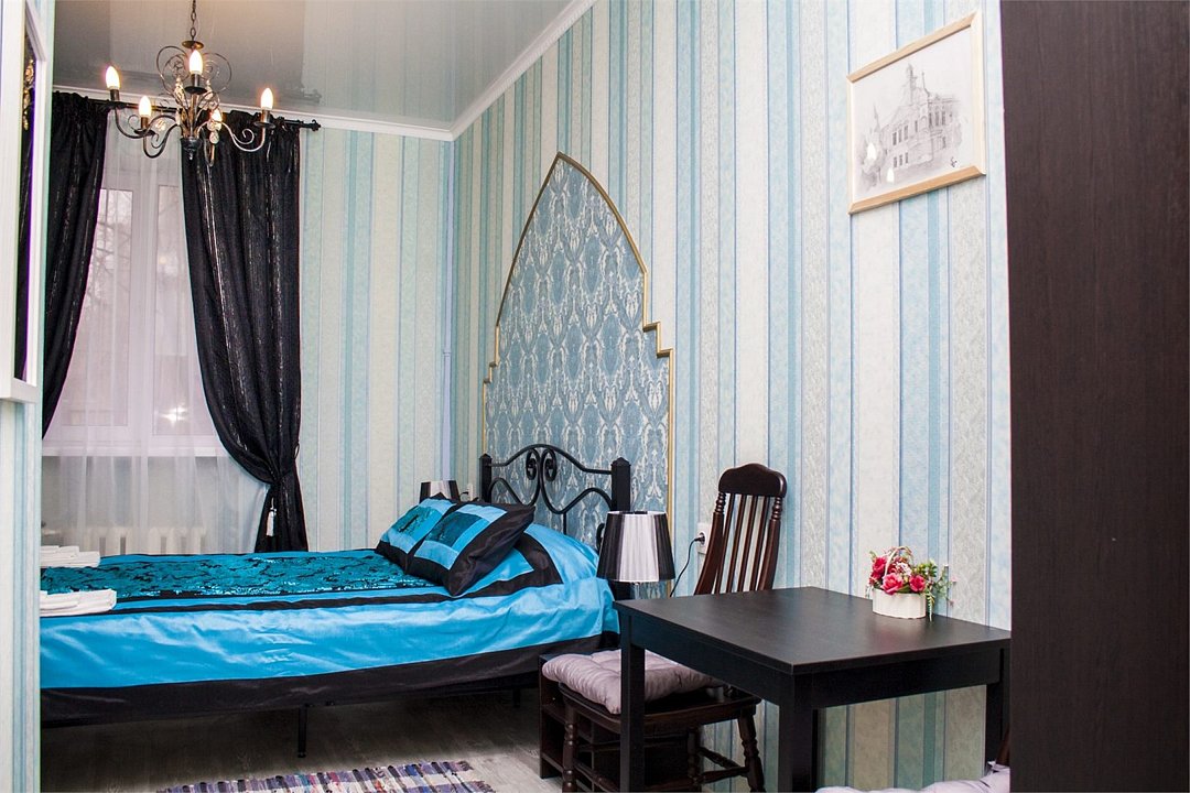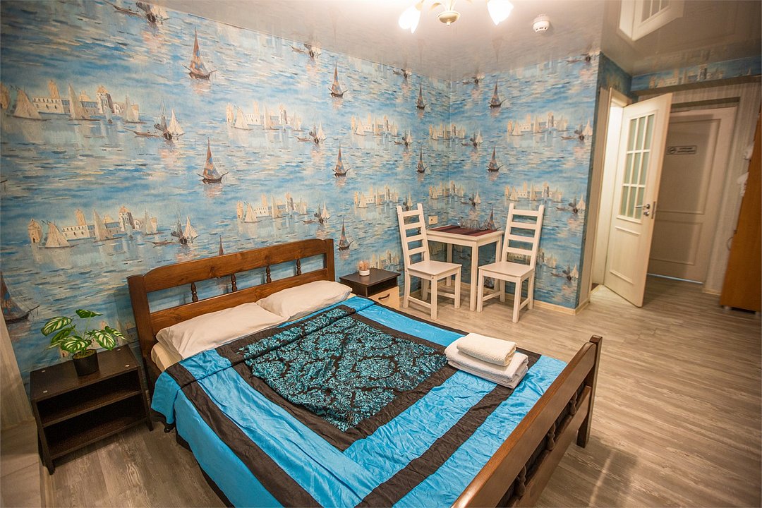 Уютный номер с двуспальной кроватью. В номере санузел, душевая, умывальник, стол и стулья, гардеробная группа, ЖК ТВ, Wi-Fi. Номер расположен в цокольном этаже есть окно. Рядом на этаже кухня : Два столика, два холодильника, МВ Печь, чайник, мойка , посуда и приборы.Возможно Доп. место.Услуги и удобства
