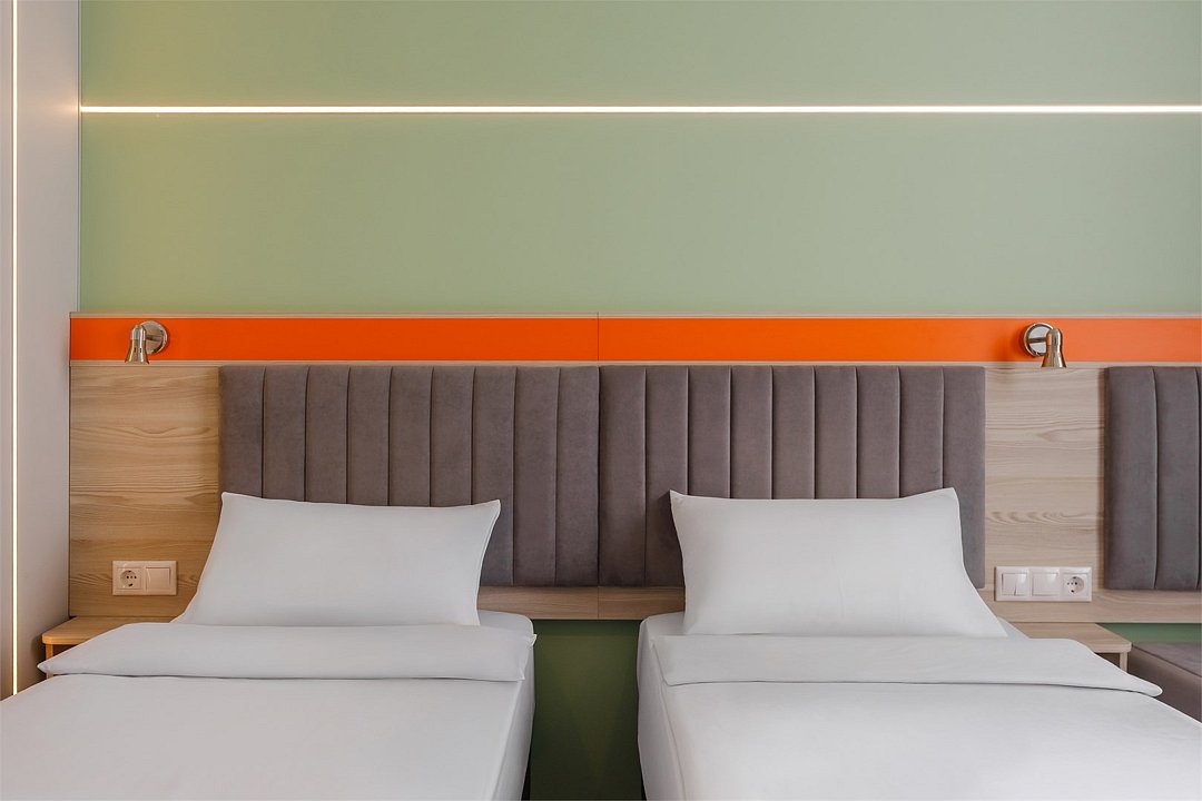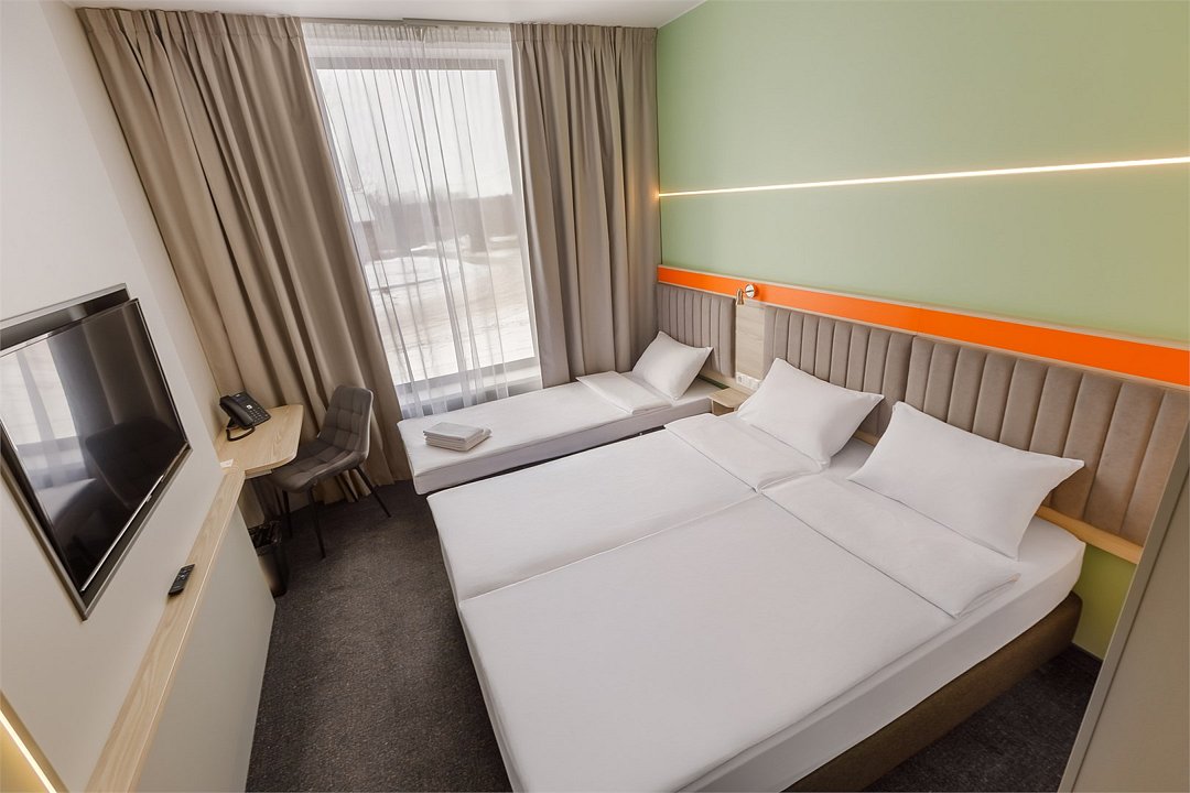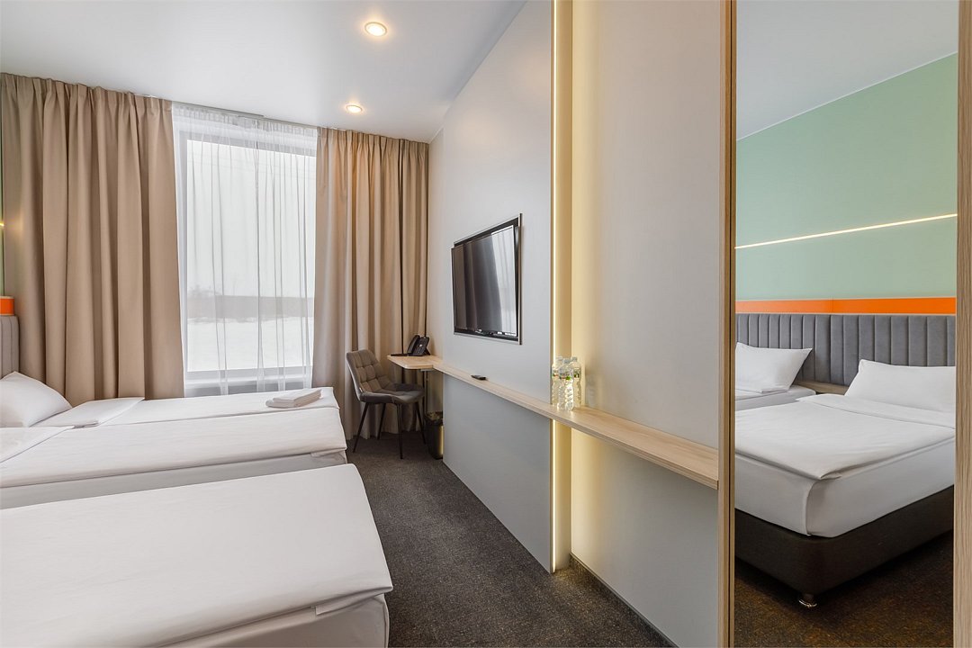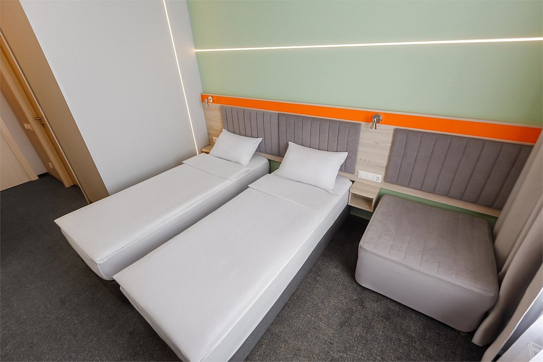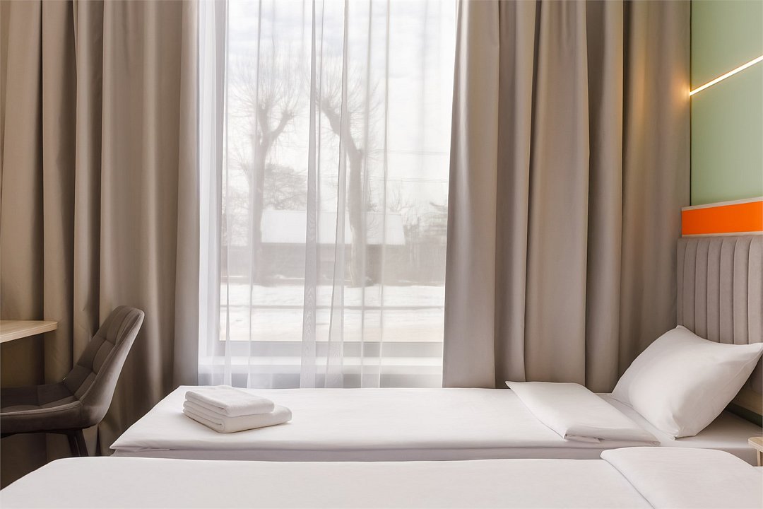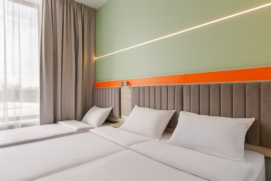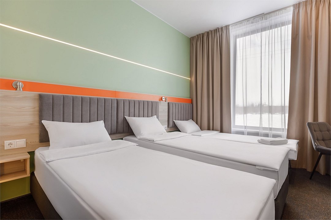 Номер площадью 18 м2 с 2 односпальными кроватями с анатомическим матрасом рассчитан на 2 взрослых и 1 ребенка. Для детей до 5 лет включительно проживание в одном номере со взрослыми предоставляется бесплатно на отдельном спальном месте. По запросу может быть предоставлена детская кроватка (для детей от 0 до 3 лет). В номере: Кровати с ортопедическими матрасами, телевизор, мини-бар, кондиционер, телефон. В собственной ванной комнате есть все необходимое для путешественников: набор полотенец, туалетно-косметические принадлежности, фен, тапочки. Для комфортного отдыха в номерах используются светонепроницаемые шторы и улучшенная звукоизоляция. Доступ к высокоскоростному интернету и рабочий уголок позволяют оперативно и комфортно решать рабочие вопросы. Размещение с домашними животными возможно за дополнительную плату только по предварительному согласованию с отелем. Собаки весом до 5 кг, кошки. Не более 1 питомца в номере. Стоимость размещения домашних животных - 1000 руб. в сутки, депозит - 5000 руб.Услуги и удобства