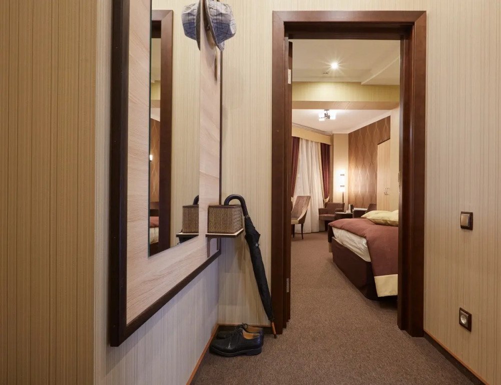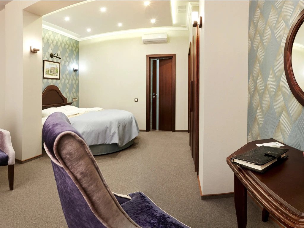 Номера оборудованы для проживания: кровати с ортопедическими матрасами, телевизор, кофе, чай, бутилированная питьевая вода, сейф, комплект полотенец, халат, тапочки, туалетные принадлежности, фен, рабочий уголок, балкон.