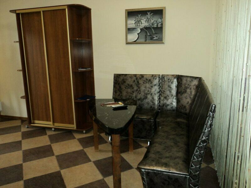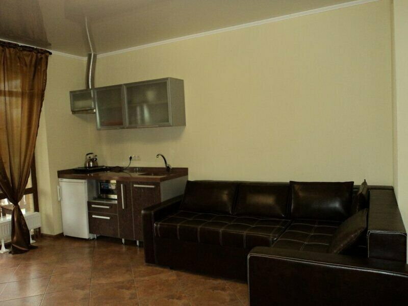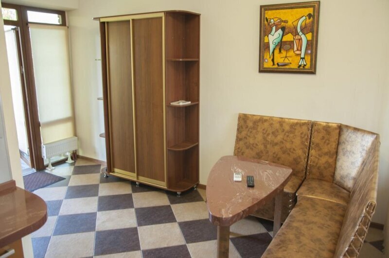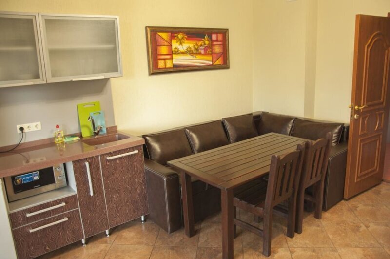 - мини — кухня: холодильник, электрочайник, кухонная мебель, столовая посуда и столовые приборы, угловой диван, столик;