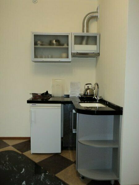 - мини — кухня: холодильник, индукционная варочная панель, кухонная мебель, столовая посуда и столовые приборы, чайник, угловой диван, столик;