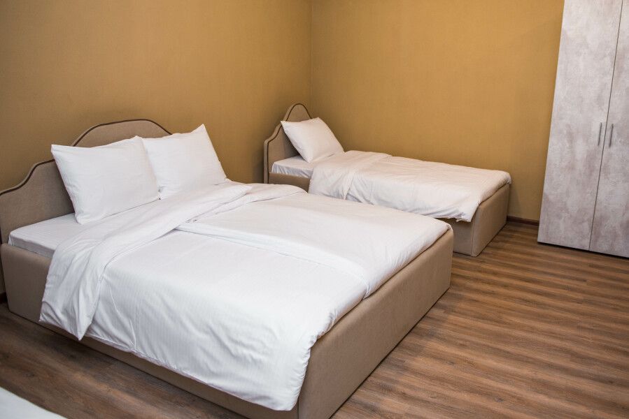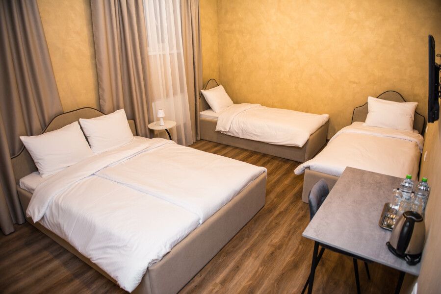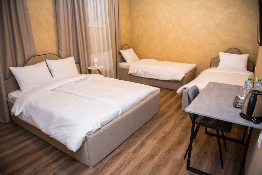 В комнате — одна большая кровать и две раздельные кровати, что обеспечивает комфортное размещение для трёх человек.