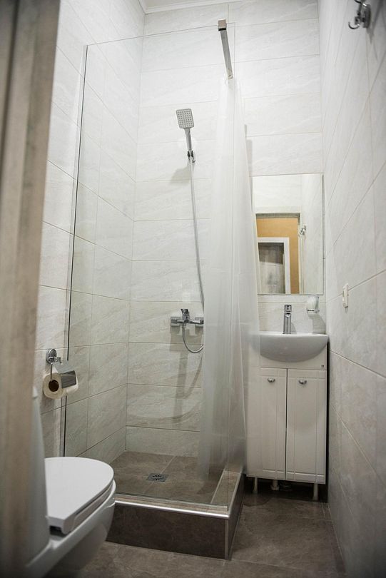 Ванная комната расположена на мансардном этаже и является общей для трёх комнат. В ней предусмотрены косметические принадлежности для гостей.