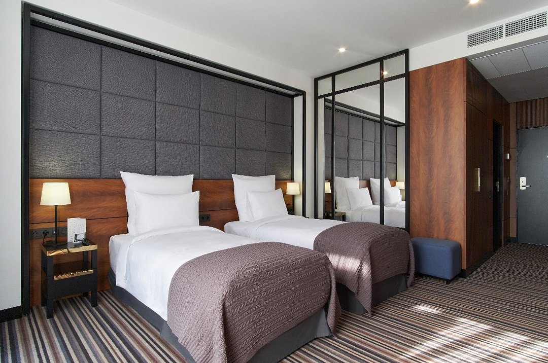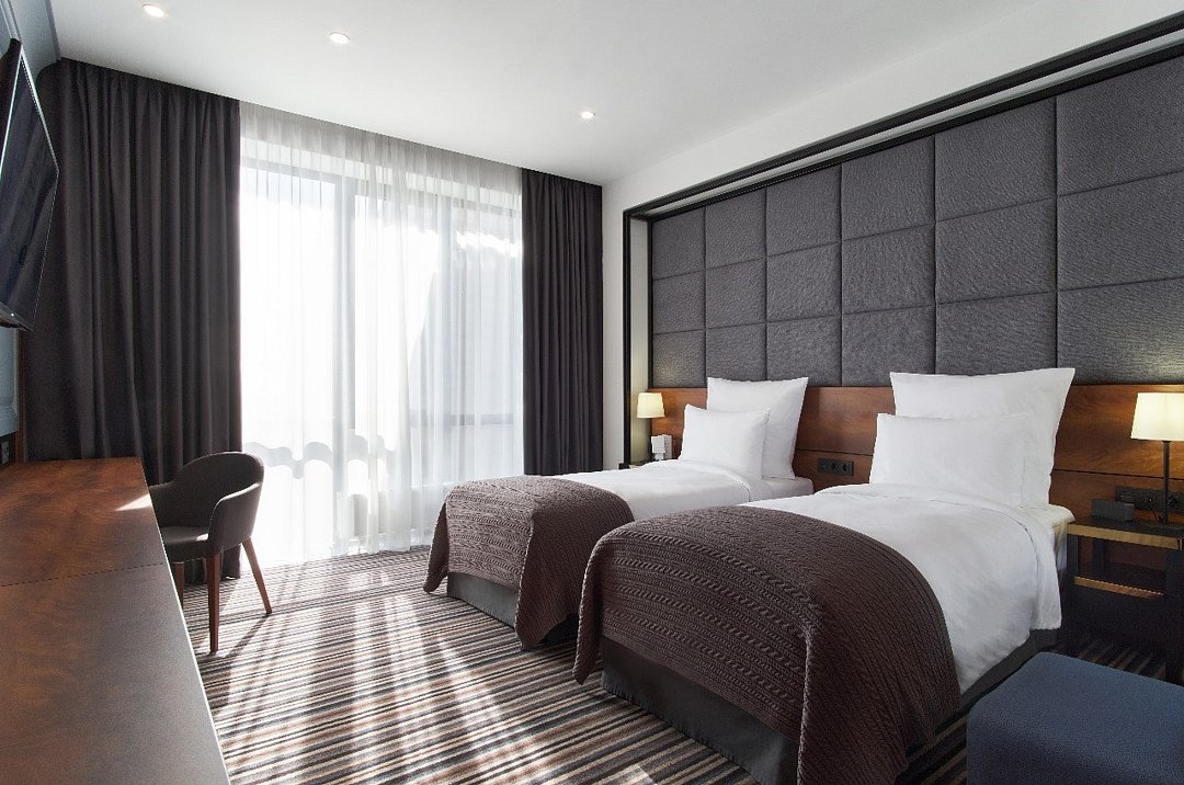 Уютный номер площадью в 24 м2 для комфортного отдыха с двумя полутораспальными кроватями. Для удобства гостей номер оборудован расширенной рабочей зоной, сейфом, мини-баром, чайной станцией. Ванная комната оснащена косметическими принадлежностями премиум уровня The Act.. Вид из окон на арт стену. Возможно размещение на дополнительном месте (по запросу).Услуги и удобства