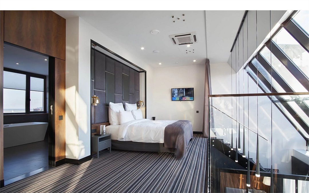 Двухуровневый панорамный сьют площадью 65 м2. В гостиной на первом этаже — большой обеденный стол и раскладной диван. На втором этаже номера находятся спальня c кроватью queen-size с мансардными окнами, просторная гардеробная и ванная комната с видом на левый берег Дона. В ванной комнате — душевая кабина, отдельно стоящая ванна и косметические принадлежности премиум уровня The Act. Возможно размещение на дополнительном месте (по запросу).Услуги и удобства