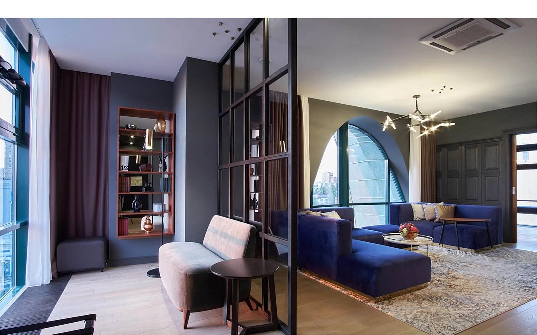 Роскошный панорамный сьют с большой гостиной, баром и лаунж-зоной. Панорамный сьют площадью 72 м2 располагает отдельным лаунджем, большой гостиной с баром и просторной спальней c кроватью queen-size. Номер находится на верхнем этаже отеля. Из панорамных окон открывается живописный вид на исторический центр города и центральную улицу. В номере есть собственный лаундж на 8 человек, который можно использовать в качестве индивидуальной переговорной. Penthouse оборудован собственной кухней, рабочей зоной, сейфом, мини-баром, чайной станцией и кофемашиной Nespresso. В ванной комнате — душевая кабина, отдельно стоящая ванна и косметические принадлежности премиум уровня The Act. Номер рассчитан на пребывание как пары, семьи с детьми или компании друзей, так и взыскательного бизнесмена. Возможно размещение на дополнительном месте (по запросу).Услуги и удобства