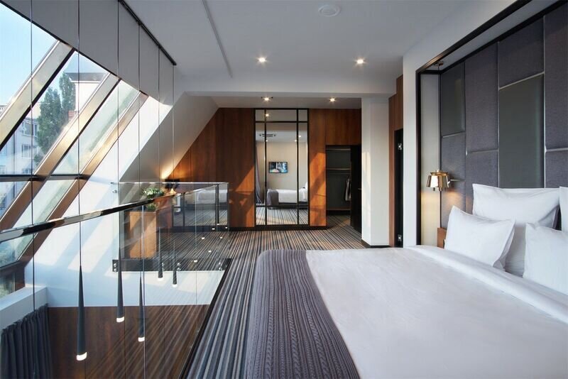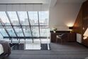 Двухуровневый панорамный сьют площадью 65 м2. В гостиной на первом этаже — большой обеденный стол и раскладной диван. На втором этаже номера находятся спальня c кроватью queen-size с мансардными окнами, просторная гардеробная и ванная комната с видом на левый берег Дона. В ванной комнате — душевая кабина, отдельно стоящая ванна и косметические принадлежности премиум уровня The Act. Возможно размещение на дополнительном месте (по запросу).Услуги и удобства