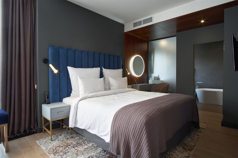 Просторный угловой сьют с панорамными окнами, из которых открывается восхитительный вид на исторический центр города. Номер площадью 35м2 оборудован расширенной рабочей зоной, сейфом, мини-баром, чайной станцией и кофемашиной Nespresso. Кровать queen-size. В ванной комнате — премиальный косметический набор The Act. Возможно размещение на дополнительном месте (по запросу).Услуги и удобства