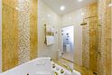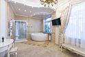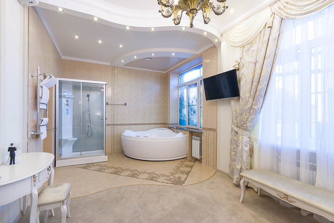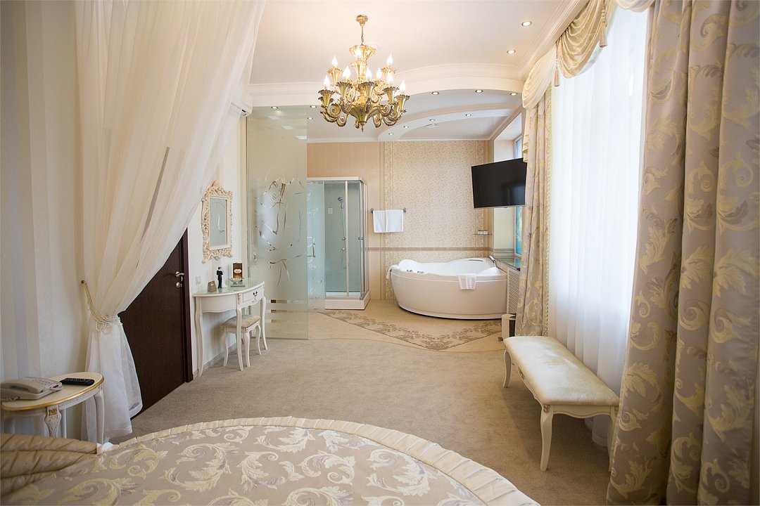 Двухкомнатный номер (65кв.м) открытой планировки в светло-бежевых тонах, витражные окна, изящная мебель и круглая кровать диаметром два метра с легким балдахином. Идеален для молодоженов, романтического свидания, годовщины. Изюминка номера - джакузи и душевая кабина в спальне. Отдельная зона гостиной с обеденным столом, собственным набором посуды и приборов, чайной станцией и бутылкой вина, в качестве комплимента. Номер не предполагает размещение с детьми. *Номер бронируется по 100% предоплате!Услуги и удобства