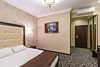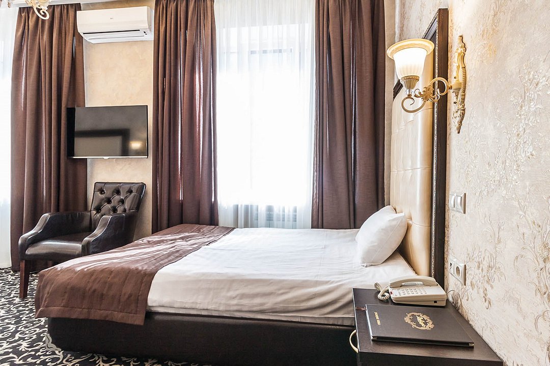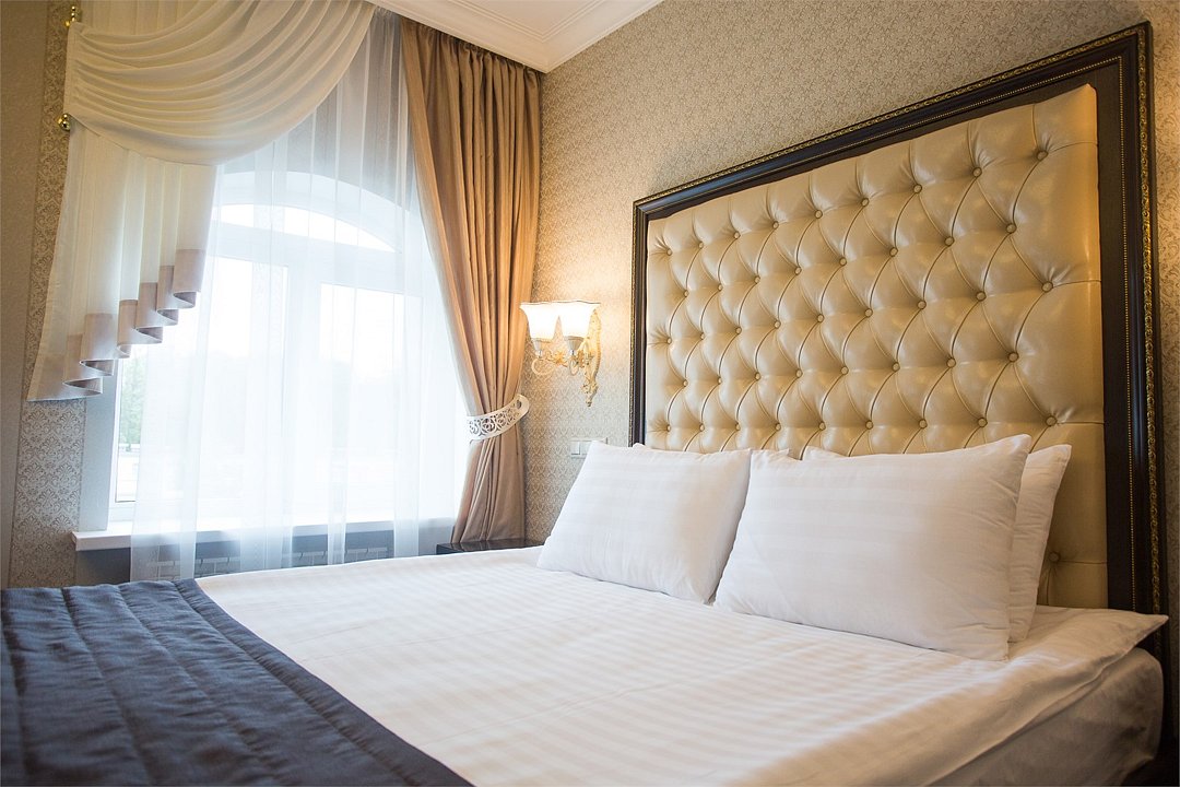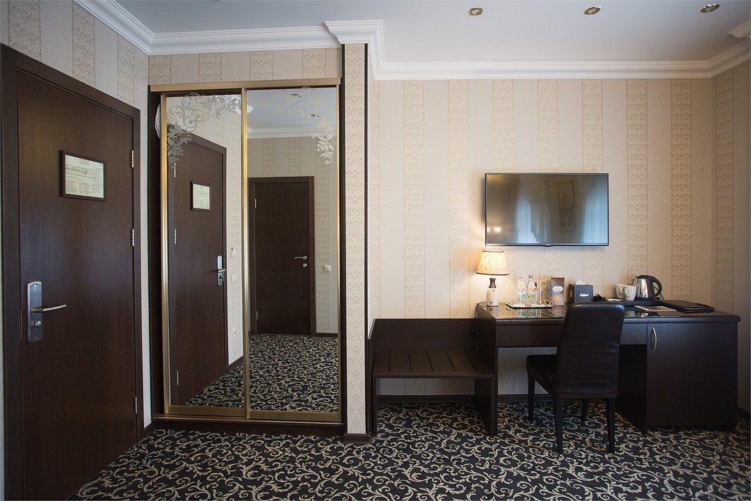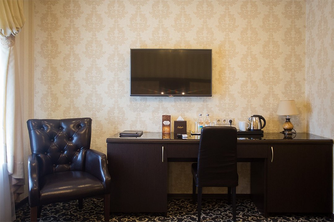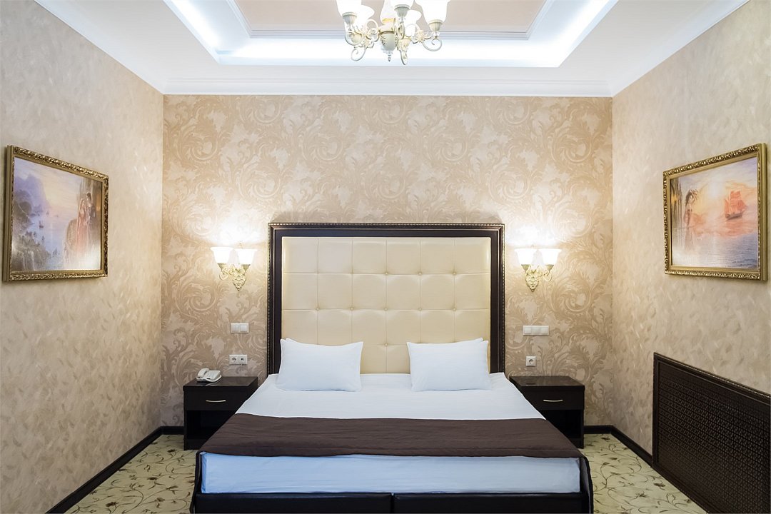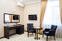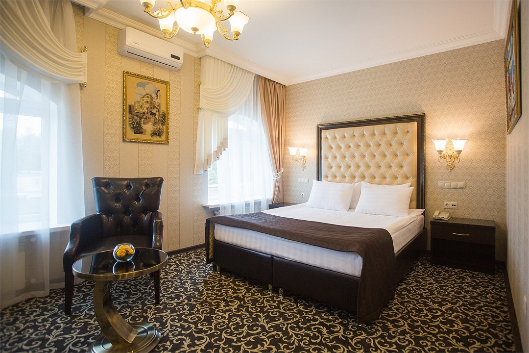 Все, что необходимо для приятного проживания есть в этом номере: большая кровать 160*200 с ортопедическим матрасом, уютное кресло, удобный стол для работы или приема пищи, просторная ванная комната с косметическими принадлежностями и набором полотенец для каждого гостя. Махровые халаты и мягкие одноразовые тапочки добавят домашнего уюта.Услуги и удобства