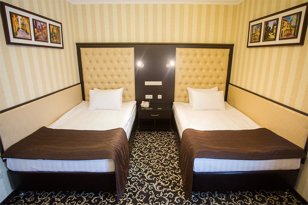Комфортный номер с рабочим местом и двумя раздельными кроватями 120*200 идеально подойдет для рабочей поездки с коллегой. Есть кресла и журнальным столик для отдыха. Ванная комната оснащена душевой системой, набором полотенец, халатов, тапочек и косметических принадлежностей на на каждого гостя.Услуги и удобства