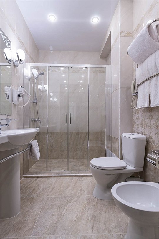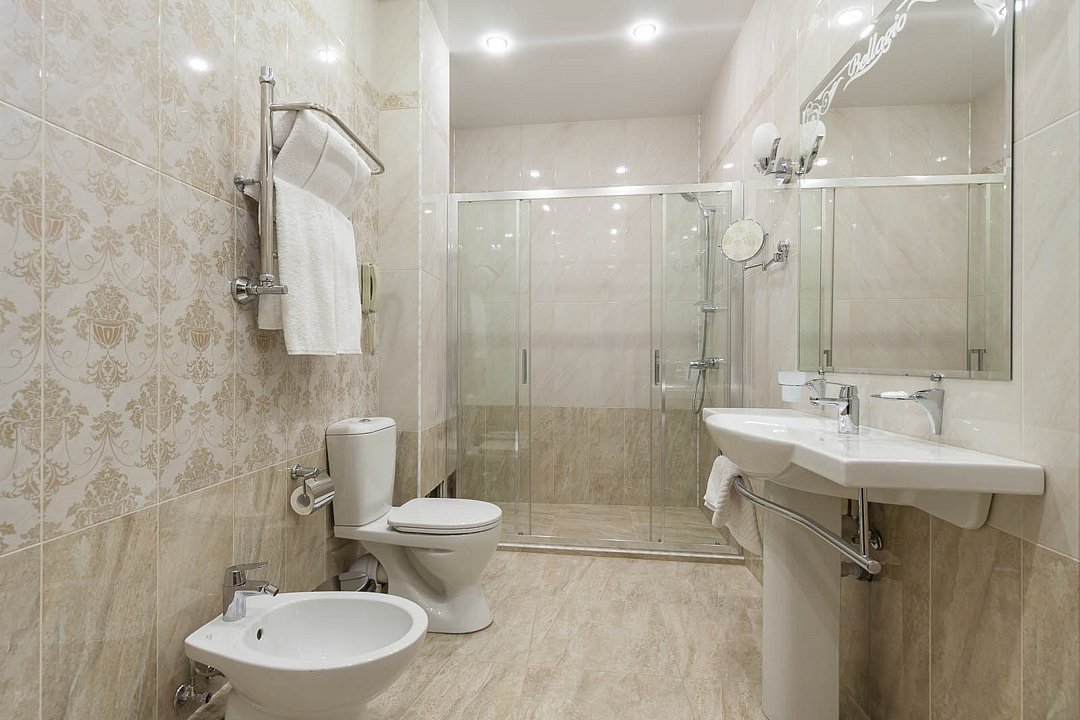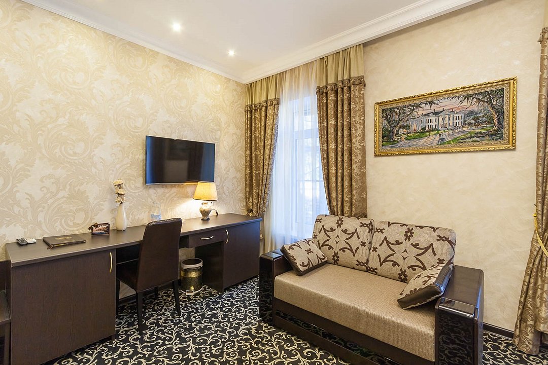 Уютный номер идеален для комфортной рабочей поездки или для проживания семьи (максимальное размещение двое взрослых и двое детей до 16 лет). Кровать 180*200 с ортопедическим матрасом, диван и журнальный столик для отдыха, большой письменный стол для работы, а так же чайная станция, набор полотенец и косметических принадлежностей. Номер оборудован просторной ванной комнатой с душевой кабиной и биде.Услуги и удобства