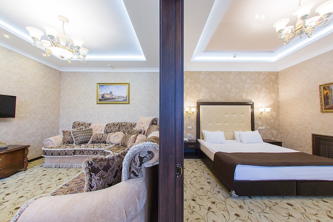Двухкомнатный Люкс (65 кв.м.) с отдельной спальней (кровать 200см*200см) и гостиной с угловым диваном. Обеденная зона с большим столом позволяет с комфортом обустроить рабочее место или принять гостей. Ванная комната с джакузи, душевой системой и поужинать в номере, сделав заказ из ресторана. Собственный набор посуды и приборов, дополнительный комплект полотенец и косметических принадлежностей, а так же бутылка вина в качестве комплимента. Идеально для проживания семьи или бизнес-поездки с комфортом. Максимальное размещение гостей в этом номере - двое взрослых и двое детей (до 16 лет). *Номер бронируется по 100% предоплате!Услуги и удобства