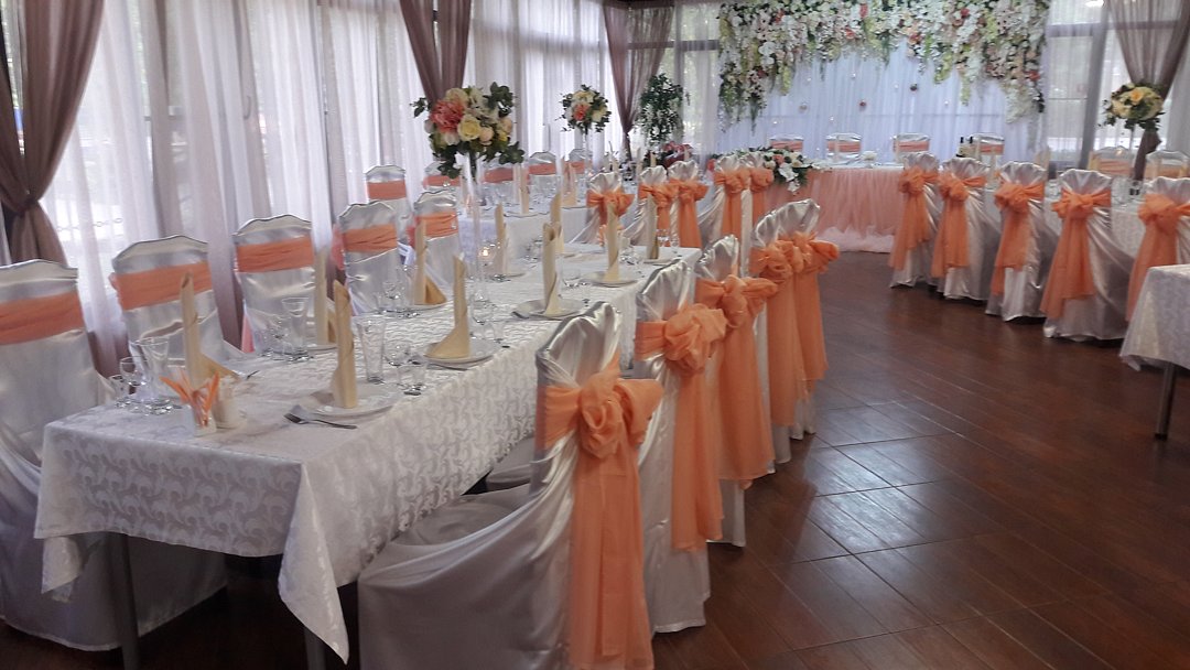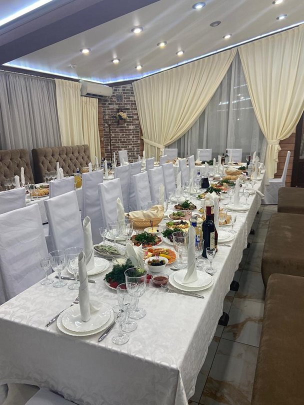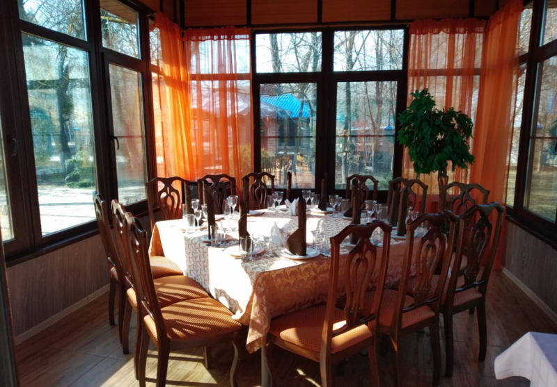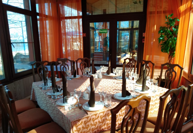 - Два зала ресторана от 30 до 80 гостей (два вида столов — круглые и прямоугольные).