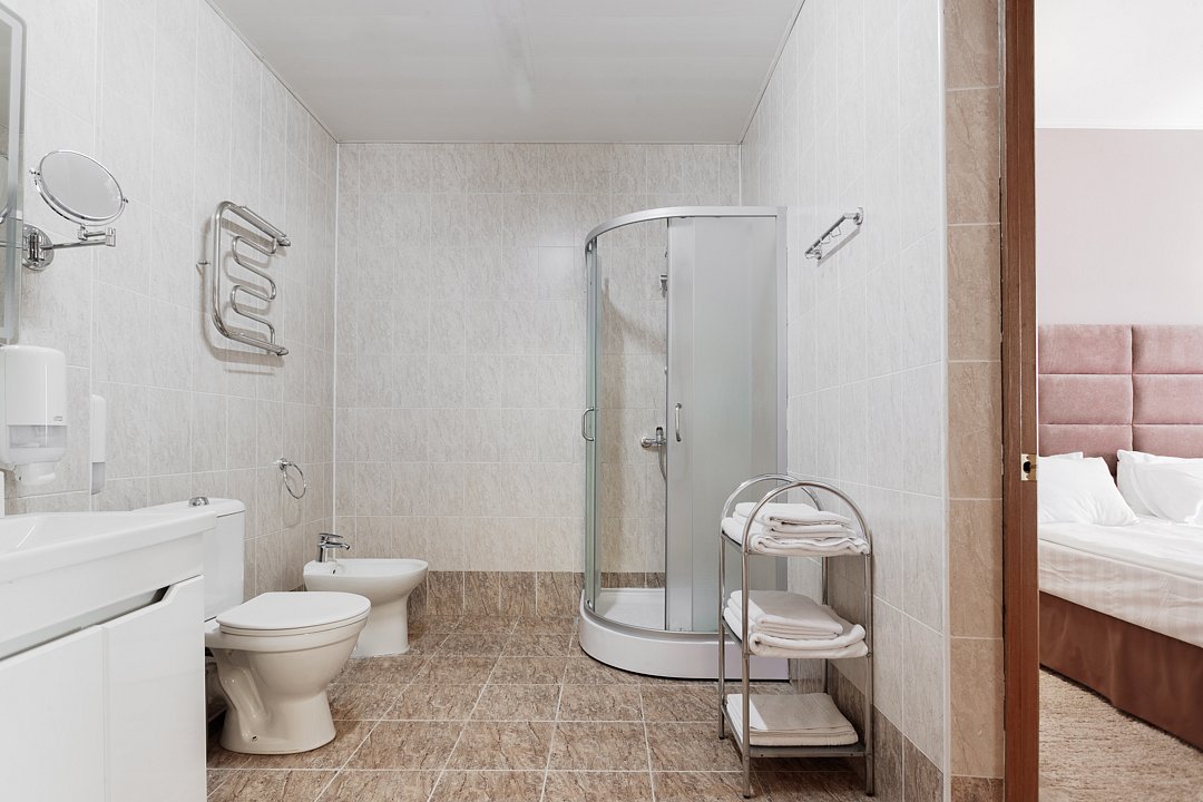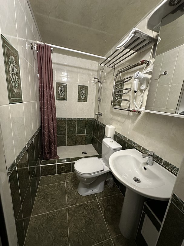 В номере - полный санузел с комплектом полотенец и косметическими принадлежностями.