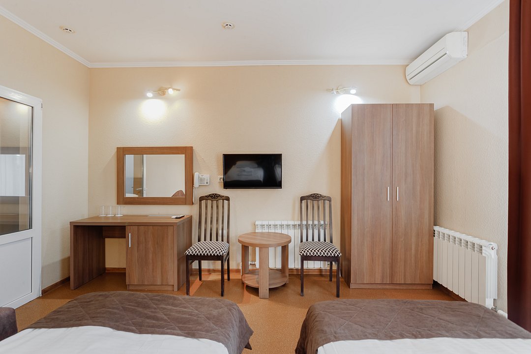 Хороший номер с современной гостиничной мебелью. В номерах, расположенных на первом этаже есть выход на улицу ,где можно посидеть за столиком у номера. Возможно одноместное и двухместное размещение.
