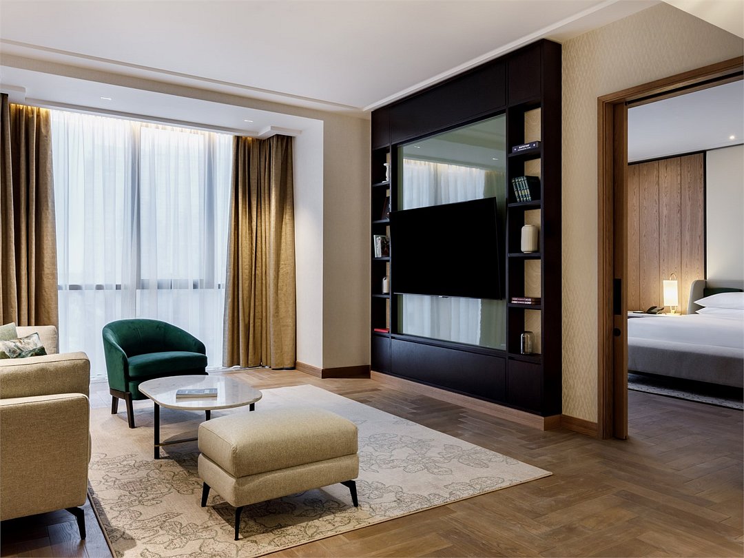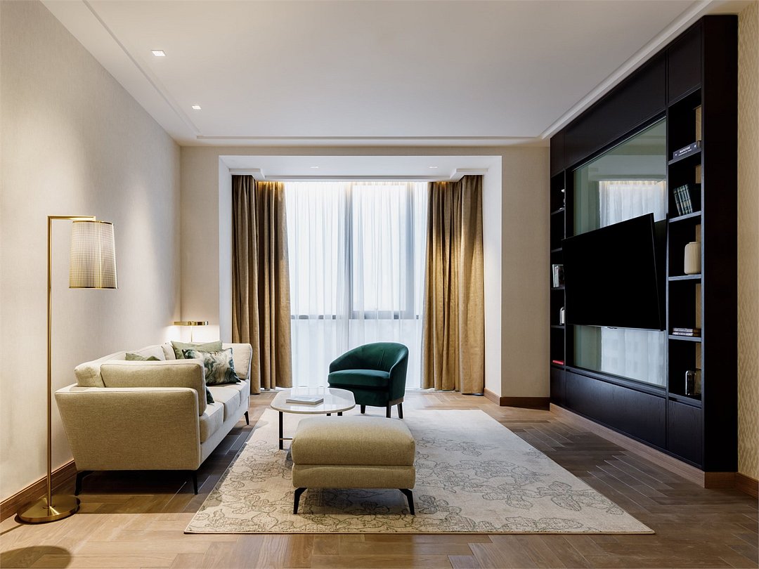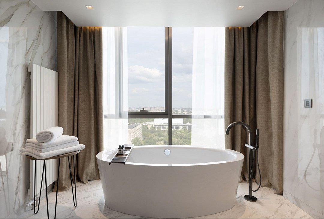 два телевизора, Wi-Fi, телефон, система климат-контроля, светильник, настольные лампы, фен, весы, будильник, электронные замки, кофемашина, утюг, ванна, теплый пол, банные принадлежности, халаты, банные полотенца, тапочки, косметические средства, кровать «King size», гладильная доска, диван, шкаф для одежды, вешалки, письменный стол, багажная тумба, зеркало, ковер, эксклюзивная мебель, две комнаты, обслуживание номеров, сейф, косметическое зеркало, гостиная зона, душ, вид на город, кулер на этаже, паркет, высокие потолки, стаканы, туалетный столик, стул, туалетный столик, туалетные средства, туалет, телевизор с плоским экраном, номер для некурящих, фанкойл, USB-порт, пуфик, чайная станция, можно с питомцамиВ гостиничном номере