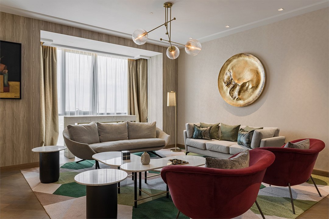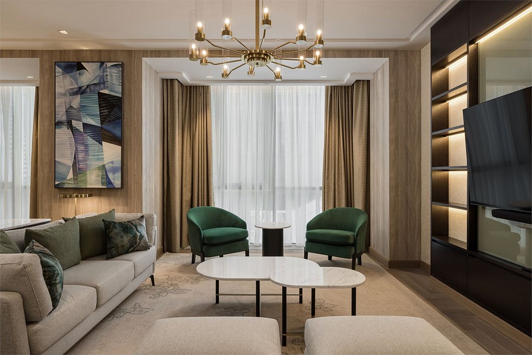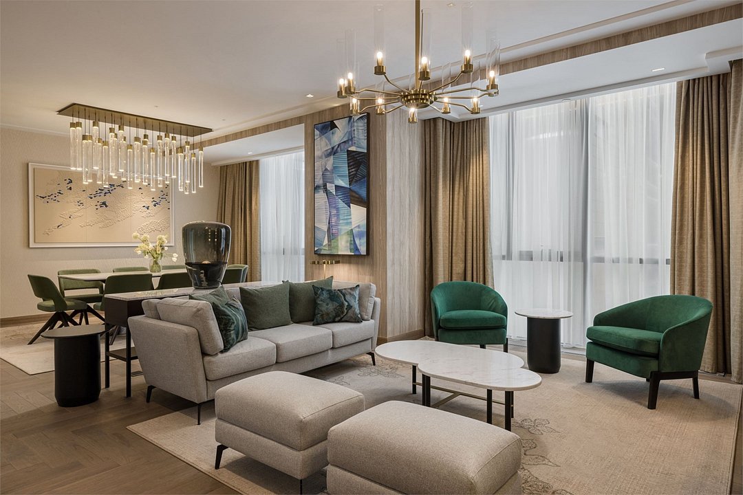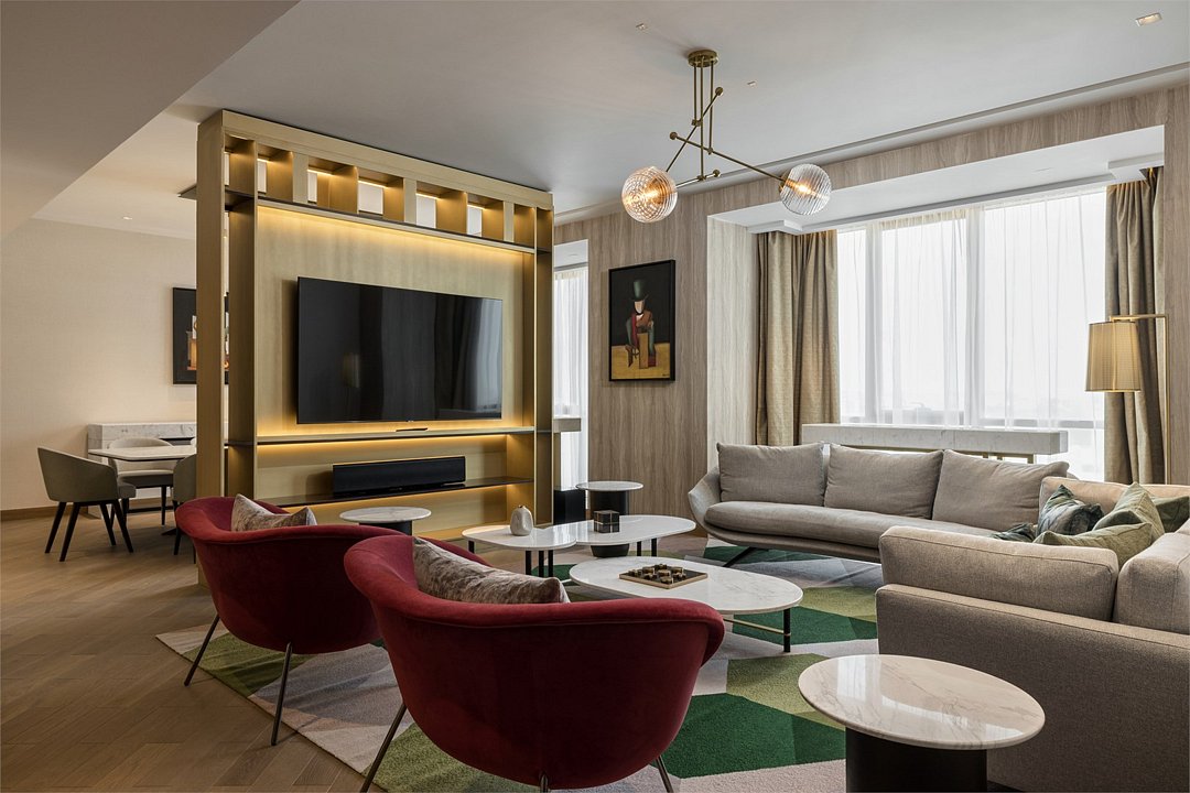 два телевизора, холодильник, система климат-контроля, светильник, настольные лампы, фен, весы, будильник, электронные замки, плита для приготовления пищи, кофемашина, утюг, ванна, биде, теплый пол, банные принадлежности, халаты, банные полотенца, тапочки, косметические средства, кровать «King size», гладильная доска, диван, шкаф для одежды, вешалки, журнальный столик, письменный стол, багажная тумба, зеркало, ковер, эксклюзивная мебель, две комнаты, кухня, обслуживание номеров, сейф, посудомоечная машина, косметическое зеркало, обеденная зона, гостиная зона, душ, вид на город, кулер на этаже, кресло, паркет, высокие потолки, стаканы, стул, туалетный столик, туалетные средства, туалет, телевизор с плоским экраном, номер для некурящих, фанкойл, USB-порт, пуфик, рабочий стол, фригобар, морозильная камера, чайная станция, можно с питомцамиВ гостиничном номере