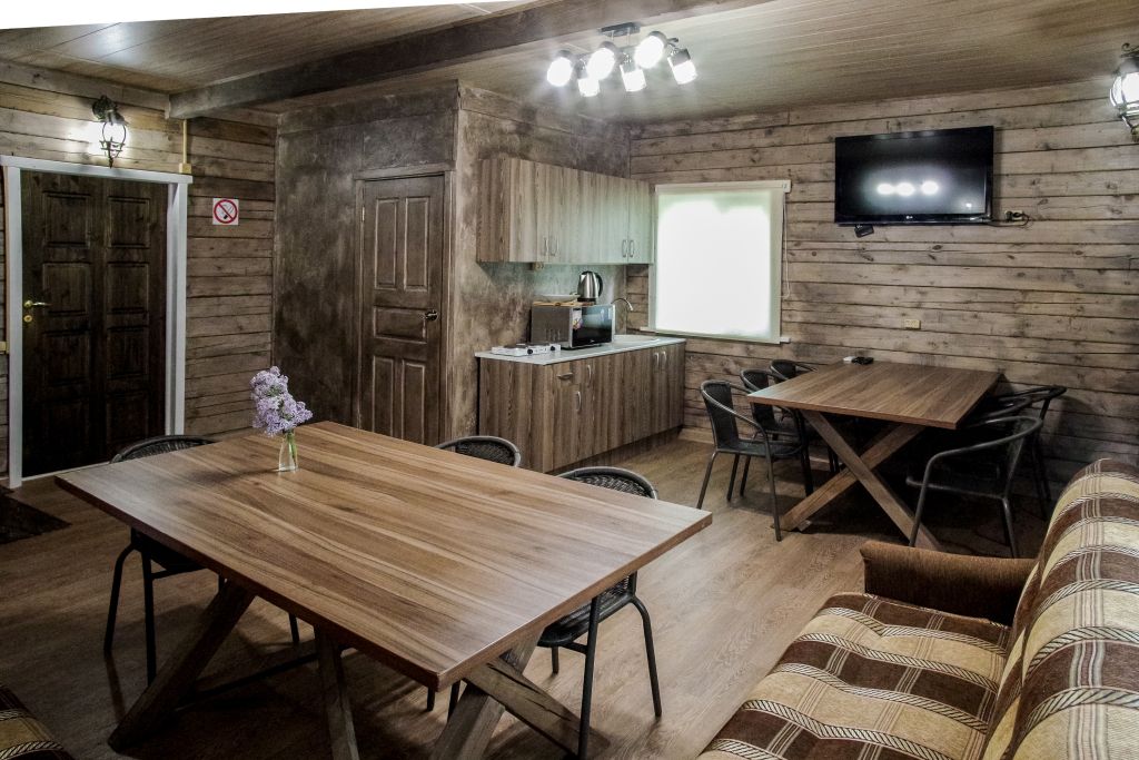 В распоряжении постояльцев полностью оборудованная общая кухня, на которой можно приготовить блюдо любой сложности. Можно разнообразить рацион и доехать до городских объектов общественного питания. Также на территории базы отдыха есть банкетный зал, рассчитанный на 70 человек.