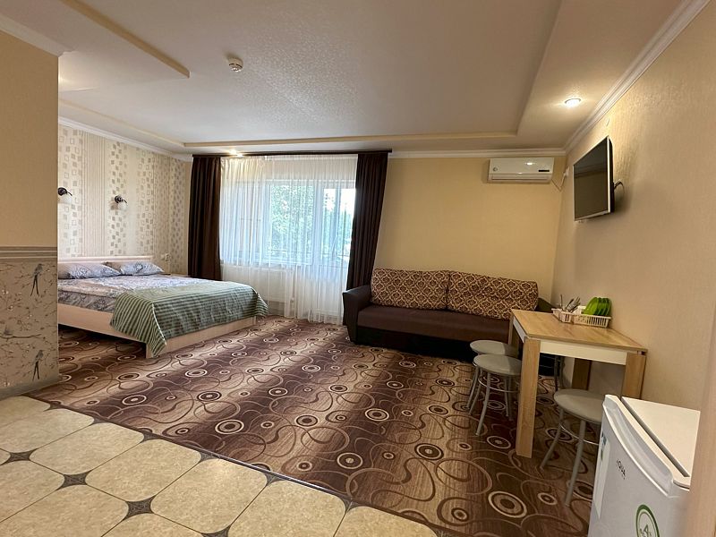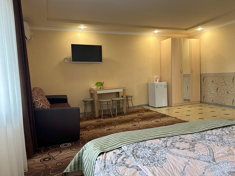 Номер полностью оборудован для комфортного проживания. В нем имеются: сплит-система, телевизор, холодильник, посуда, обеденный столик и стулья. Вы можете полноценно перекусить, никуда для этого не выходя.