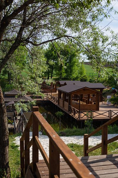 И то, что беседка за 2000 рублей предоставляется вам на другом берегу этого пруда, на который нужно переходить по хлипкому, раскачивающемуся во все стороны мостику, уже не показалось таким страшным недостатком, как лошадиное дерьмо в воде на пляже для людей! И все-таки, когда вы хотите пожарить шашлык, вы должны со всем скарбом-кастрюли, тарелки, питье, другая еда, приборы, и т.д. тащить в зубах через подвесной мост! И обратно, соответственно! Посидев там пару часов в первый день, больше туда и не поперлись. Притом, что на той стороне не покупаться даже. Только грязные и липкие столы под крышей, к которым персонал и не приближается! Ни о какой уборке речь не идет! Только оплата 2000 руб, хоть и на час ты туда сходишь. Хотя стоит проживание для такой локации заоблачно дорого, однако, даже для проживающих эти столы под крышей платные! Вобщем, не приведи Господь больше туда приехать! Ах, да, еще вместо "Здравствуйте", нас тут же, по приезду, облаяли, что мы подъехали ко входу, чтобы выгрузить вещи! Нельзя, сказали, ни на пять минут, ни на одну. Таскайте, говорит хозяйка, со стоянки! И скрылась за дверью, около которой стояли не одна машина! -