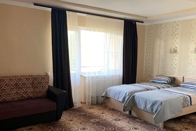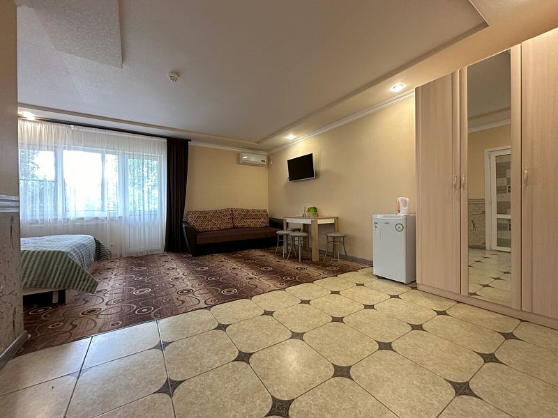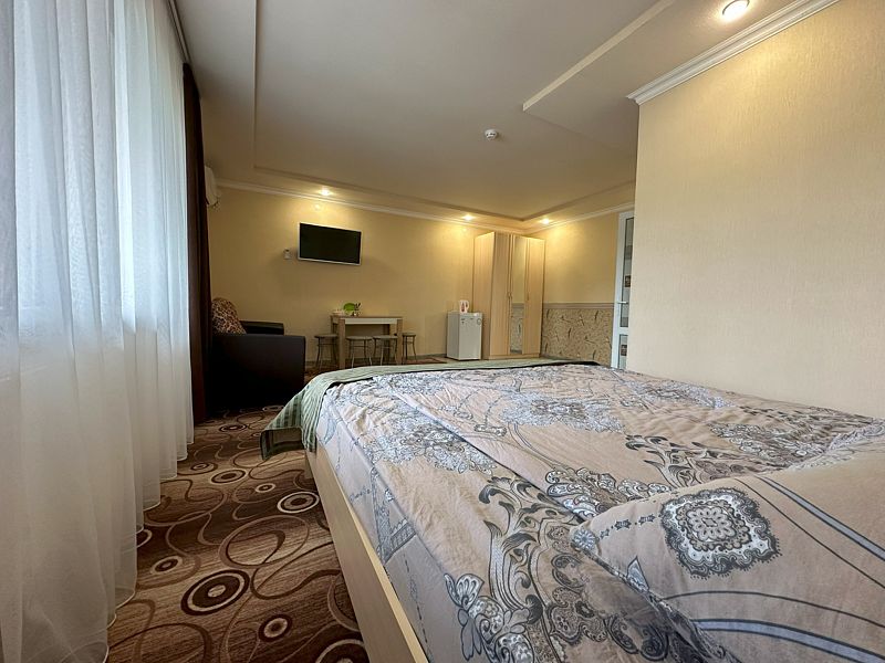 Все номера просторные, светлые, со свежим ремонтом и новой мебелью. В номере одна большая двуспальная кровать плюс раскладной двухместный диван. Максимальное размещение — четыре человека.