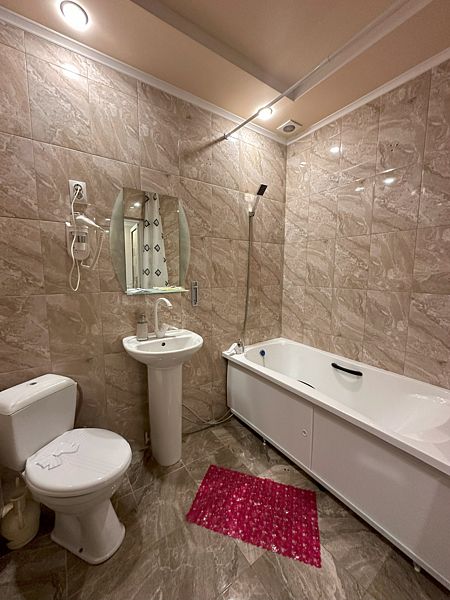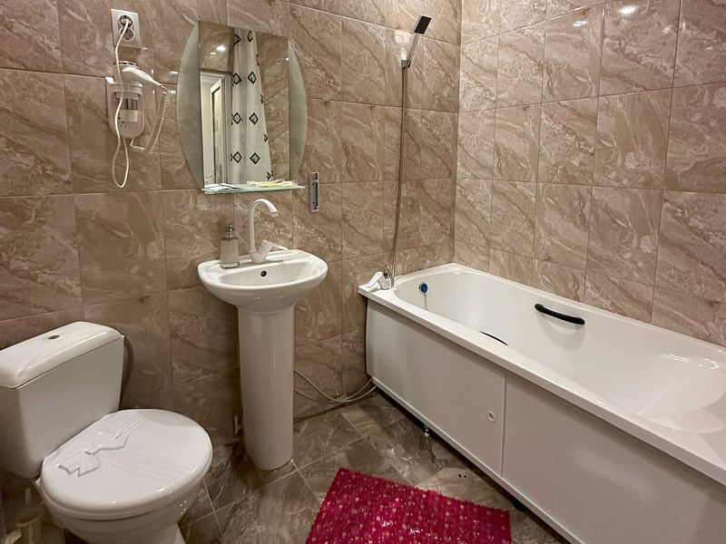 Санузел оснащен новой качественной сантехникой и феном. Имеется комплект полотенец. Горячая и холодная вода без перебоев. Утюг и гладильную доску приносит горничная по просьбе наших гостей.