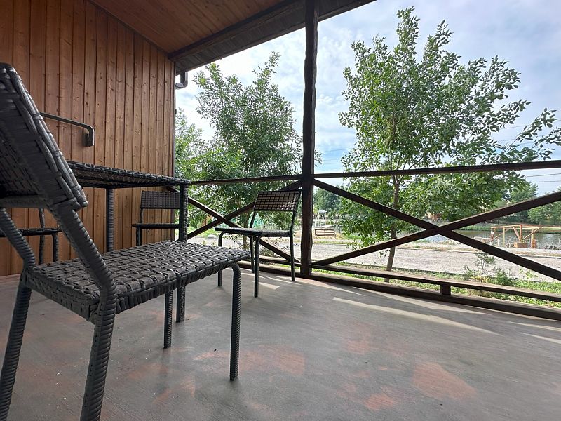 Из каждого номера имеется выход на большую персональную террасу с красивым видом на озеро и окружающие поля и сады.