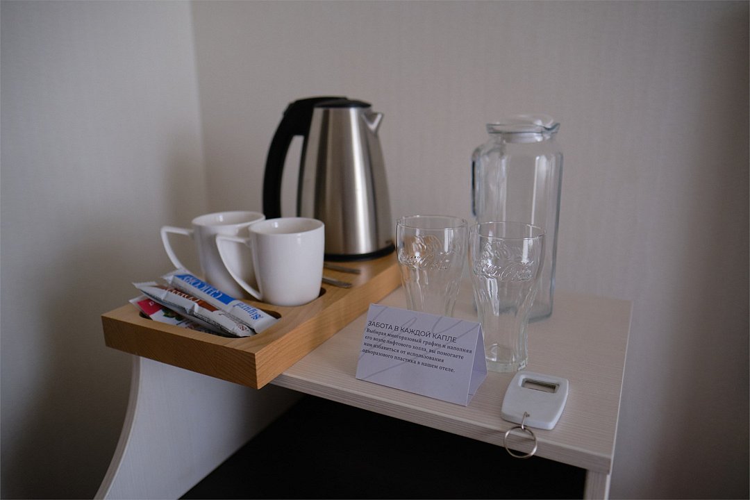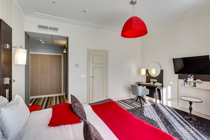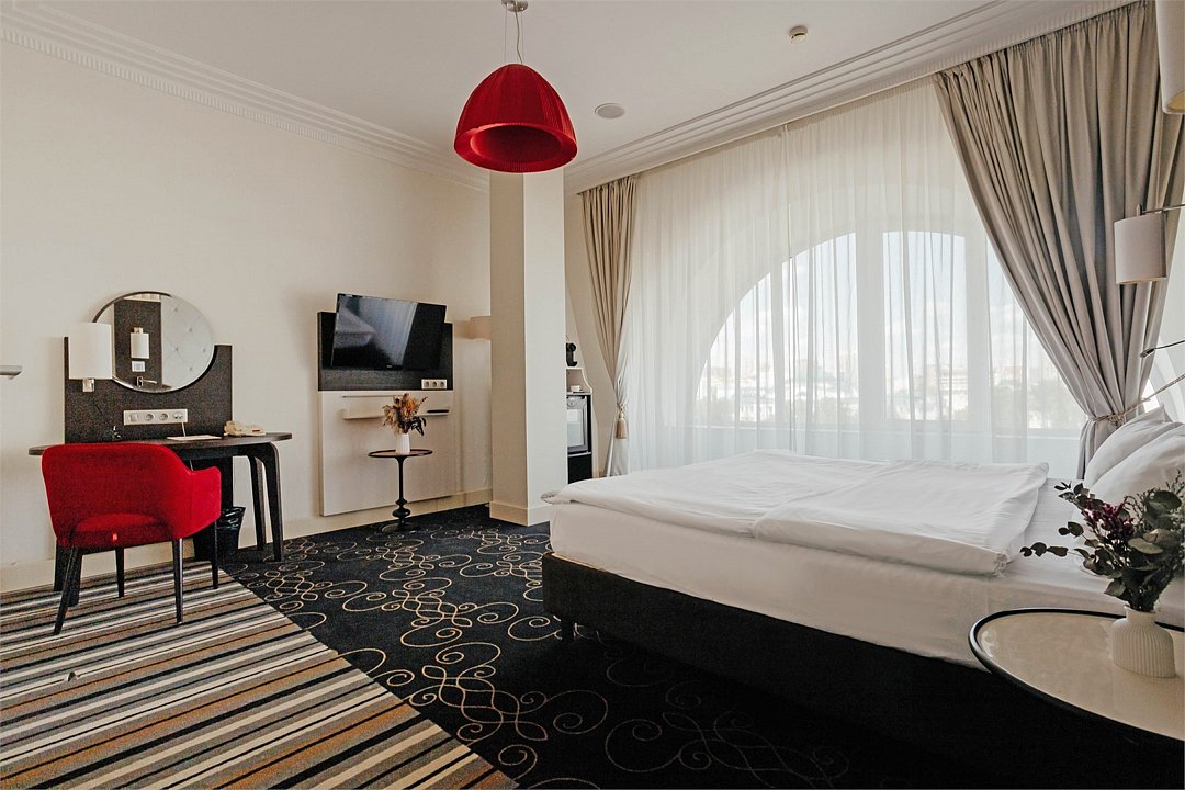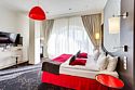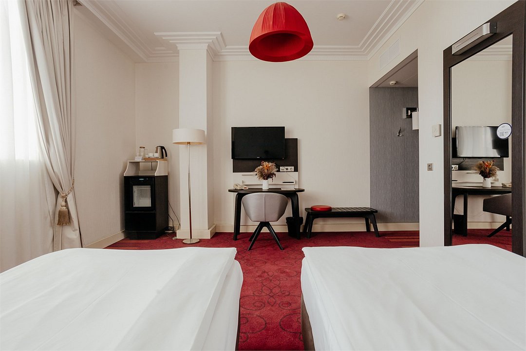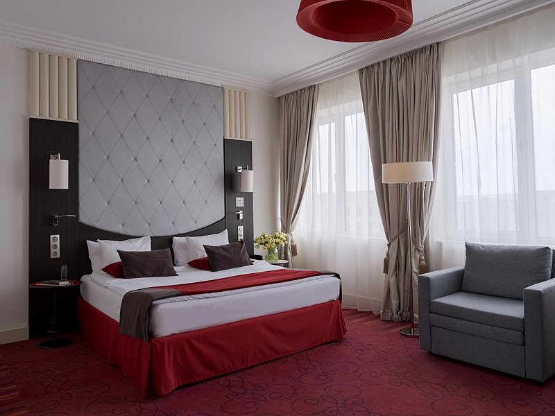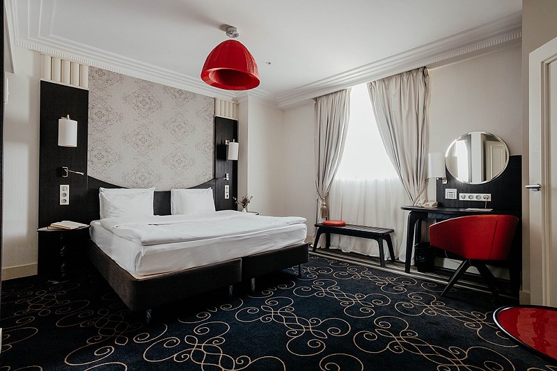 Просторный номер оборудован Wi-Fi, рабочей зоной, сейфом, ЖК ТВ с кабельными и спутниковыми телеканалами, мини-баром, станцией для приготовления кофе и чая. Комфортные кровати со специальными ортопедическими матрасами позволят Вам по-настоящему расслабиться, а гарантией хорошего сна послужат шторы блэкаут. Каждый номер включает в себя ванную комнату, оснащенную премиальной органической косметикой, феном, тапочками и косметическими принадлежностями. Площадь номеров имеет возможность размещения дополнительного места в виде складной евро-кровати (по запросу).Услуги и удобства