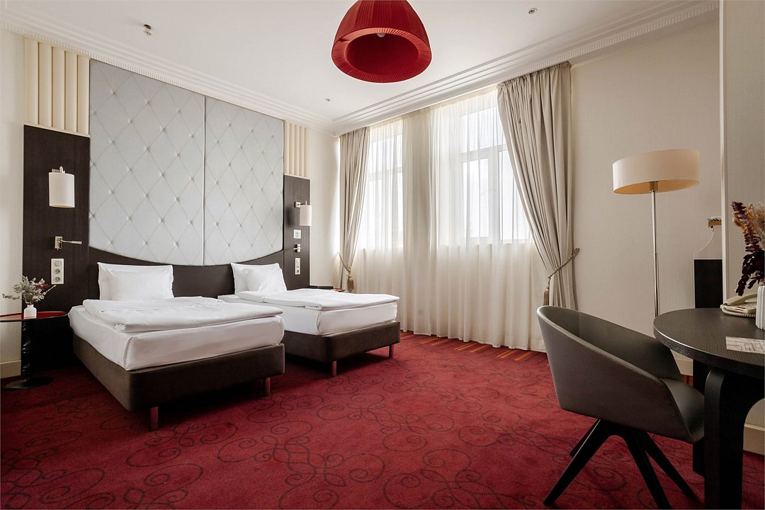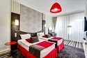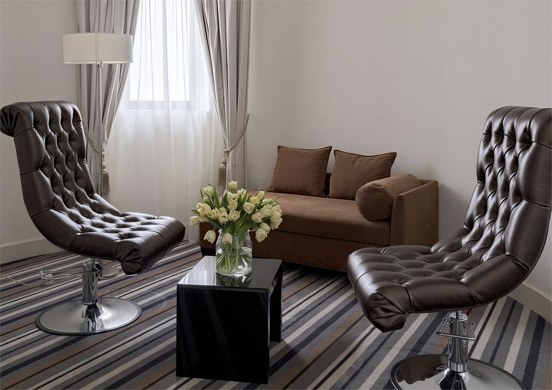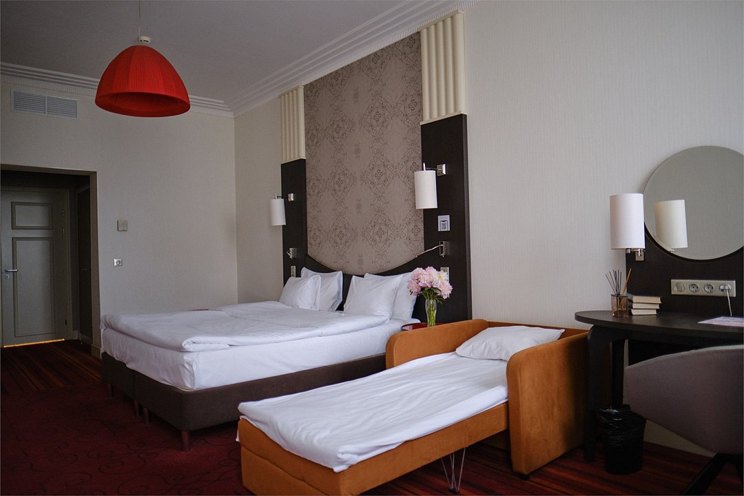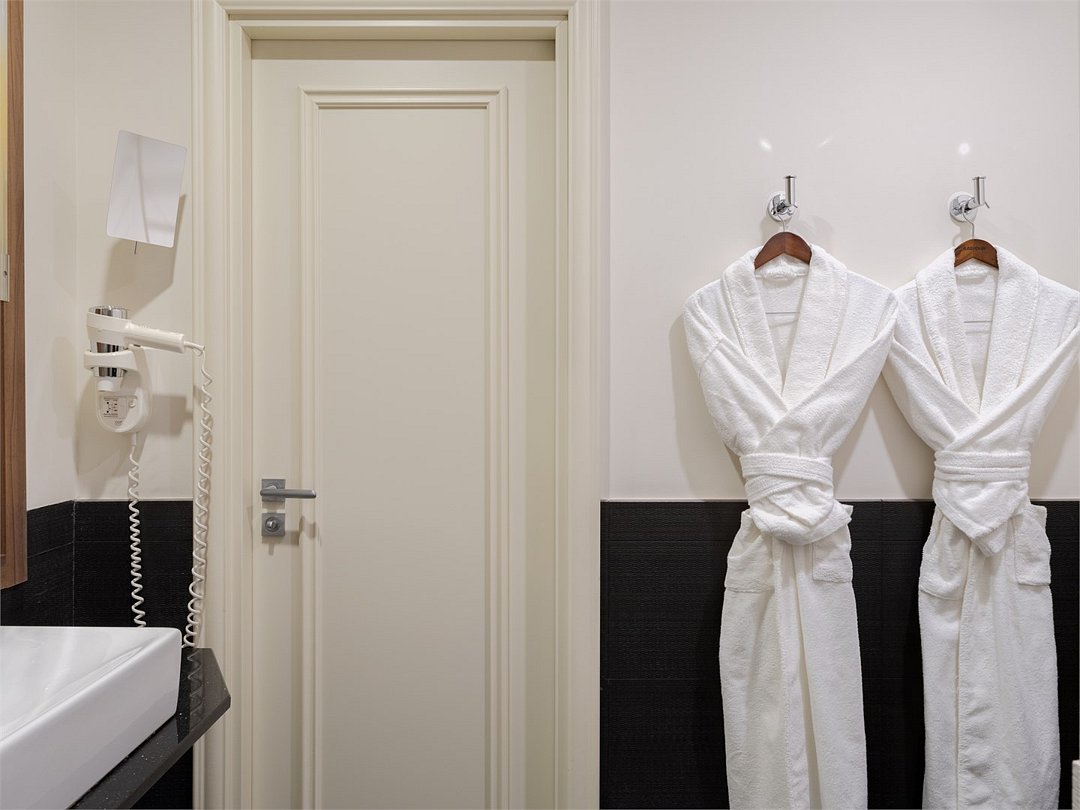 Просторный номер оборудован Wi-Fi, рабочей зоной, сейфом, ЖК ТВ с кабельными и спутниковыми телеканалами, мини-баром, станцией для приготовления кофе и чая. Комфортные кровати со специальными ортопедическими матрасами позволят Вам по-настоящему расслабиться, а гарантией хорошего сна послужат шторы блэкаут. Каждый номер включает в себя ванную комнату, оснащенную премиальной органической косметикой, феном, тапочками и косметическими принадлежностями. Площадь номеров имеет возможность размещения дополнительного места в виде складной евро-кровати (по запросу).Услуги и удобства
