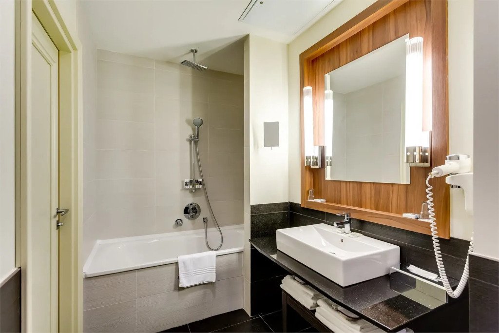 телевизор, спутниковое телевидение, Wi-Fi, интернет, телефон, светильник, фен, электронные замки, кофемашина, ванная комната, душевая кабина, ванна, санузел, банные принадлежности, халаты, банные полотенца, тапочки, двуспальная кровать, тумбы, шкаф для одежды, журнальный столик, багажная тумба, зеркало, мини-бар, чайный набор, информационная карта, меню, сейф, минеральная вода, чайник, унитаз, раковина, косметическое зеркало, душ, вид на город, кресло, центральное кондиционирование, стаканы, туалетный столик, туалетные средства, туалет, внутренний телефон, телевизор с плоским экраном, гостиничная парфюмерия, номер для некурящих, фанкойл, рабочий стол, холодильный шкаф, электронный консьерж 24/7, оснащение для гостей с ограниченными возможностями, чайная станция, экологичный подход, шапочка для душа, мыло, затемняющая штора, прачечная (за дополнительную плату), можно с питомцами, лежанка, тропический душВ номере