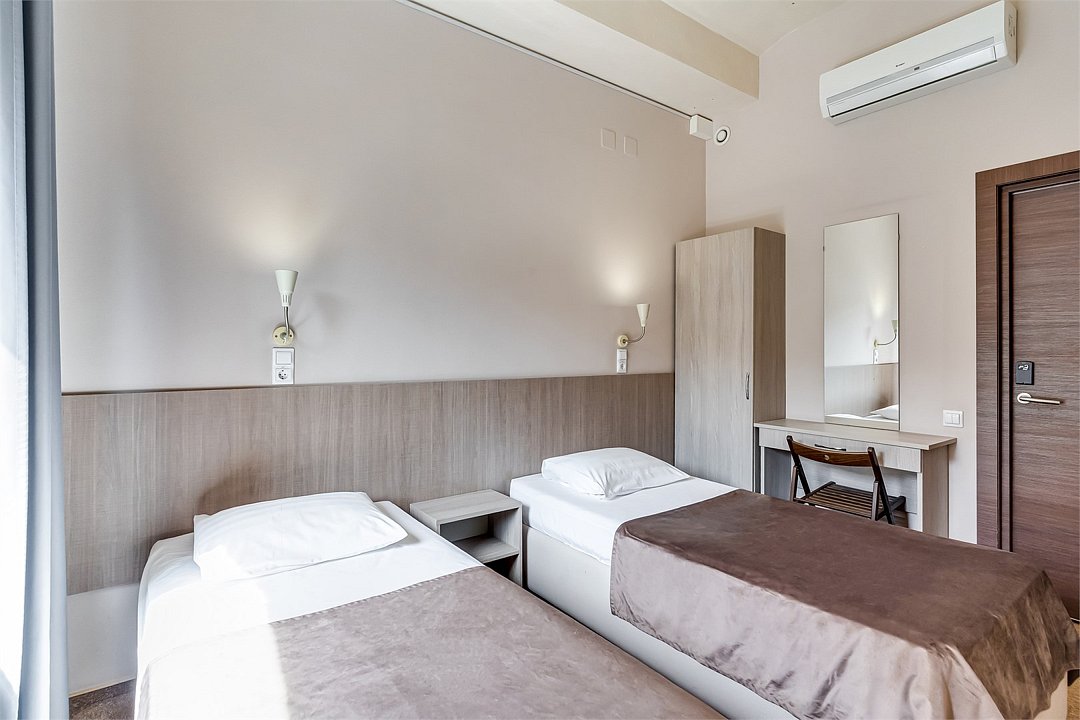 Wi-Fi, светильник, фен, электронные замки, банные полотенца, тапочки, косметические средства, две односпальные или большая двуспальная кровать, тумбы, шкаф для одежды, вешалки, журнальный столик, зеркало, звуконепроницаемые стены и окна, чайный набор, ковровое покрытие, кулер на этаже, центральное кондиционирование, общая ванная комната, вид во двор, стаканы, столовые приборы, туалетный столик, внешняя ванная комната, стул, туалетные средства, санузел на этаже, сплит-система, цифровое тв, телевизор с плоским экраном, москитная сетка, гостиничная парфюмерия, душ на этаже, номер для некурящихВ номере