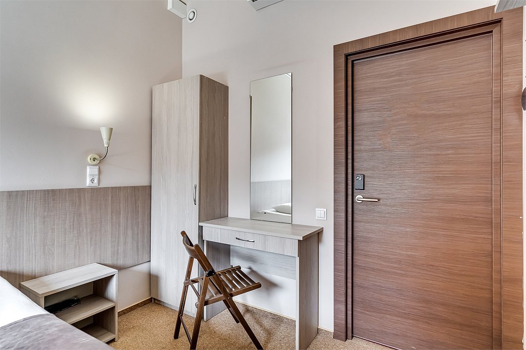 Wi-Fi, кондиционер, система климат-контроля, светильник, фен, будильник, электронные замки, банные принадлежности, банные полотенца, тапочки, односпальная кровать, шкаф для одежды, вешалки, письменный стол, зеркало, звуконепроницаемые стены и окна, письменные принадлежности, чайный набор, ковровое покрытие, отопление, раздельный санузел, общая ванная комната, вид во двор, стаканы, столовые приборы, стул, тумба, туалетные средства, санузел на этаже, сплит-система, цифровое тв, телевизор с плоским экраном, москитная сетка, гостиничная парфюмерия, душ на этажеВ номере